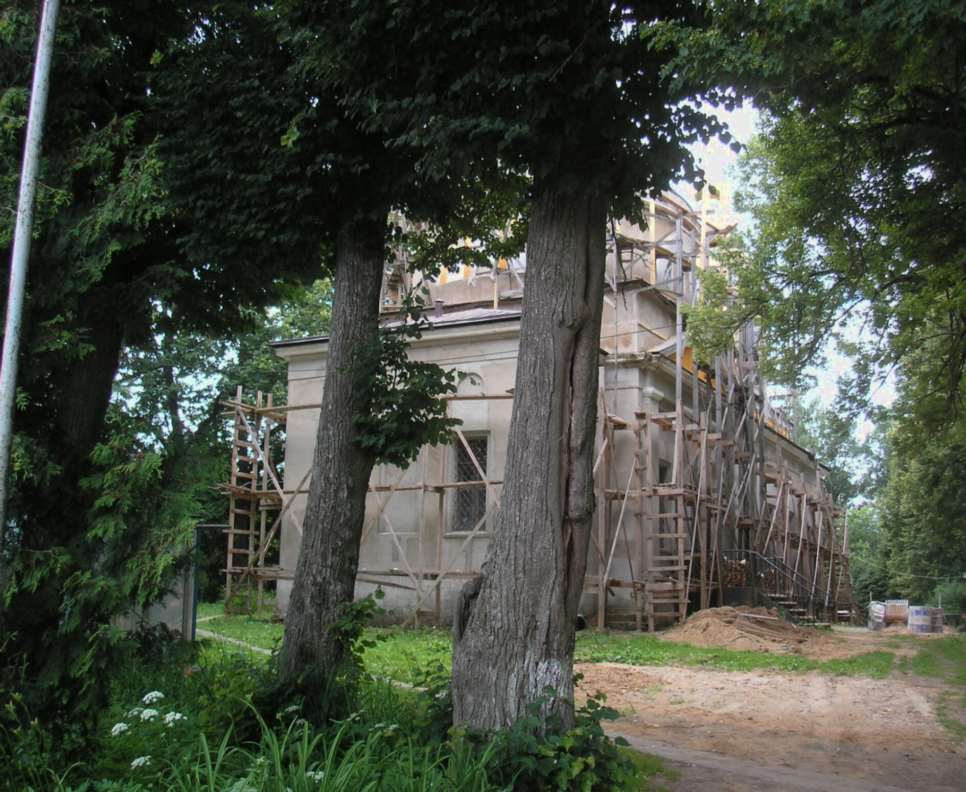 На представленной фотографии запечатлён Храм Рождества Христова, расположенный в старинном селе Рождествено Солнечногорского городского округа Московской области. Святыня, возведённая в стиле классицизма в конце XVIII века, находится на этапе комплексной реставрации, о чём красноречиво свидетельствуют установленные строительные леса.