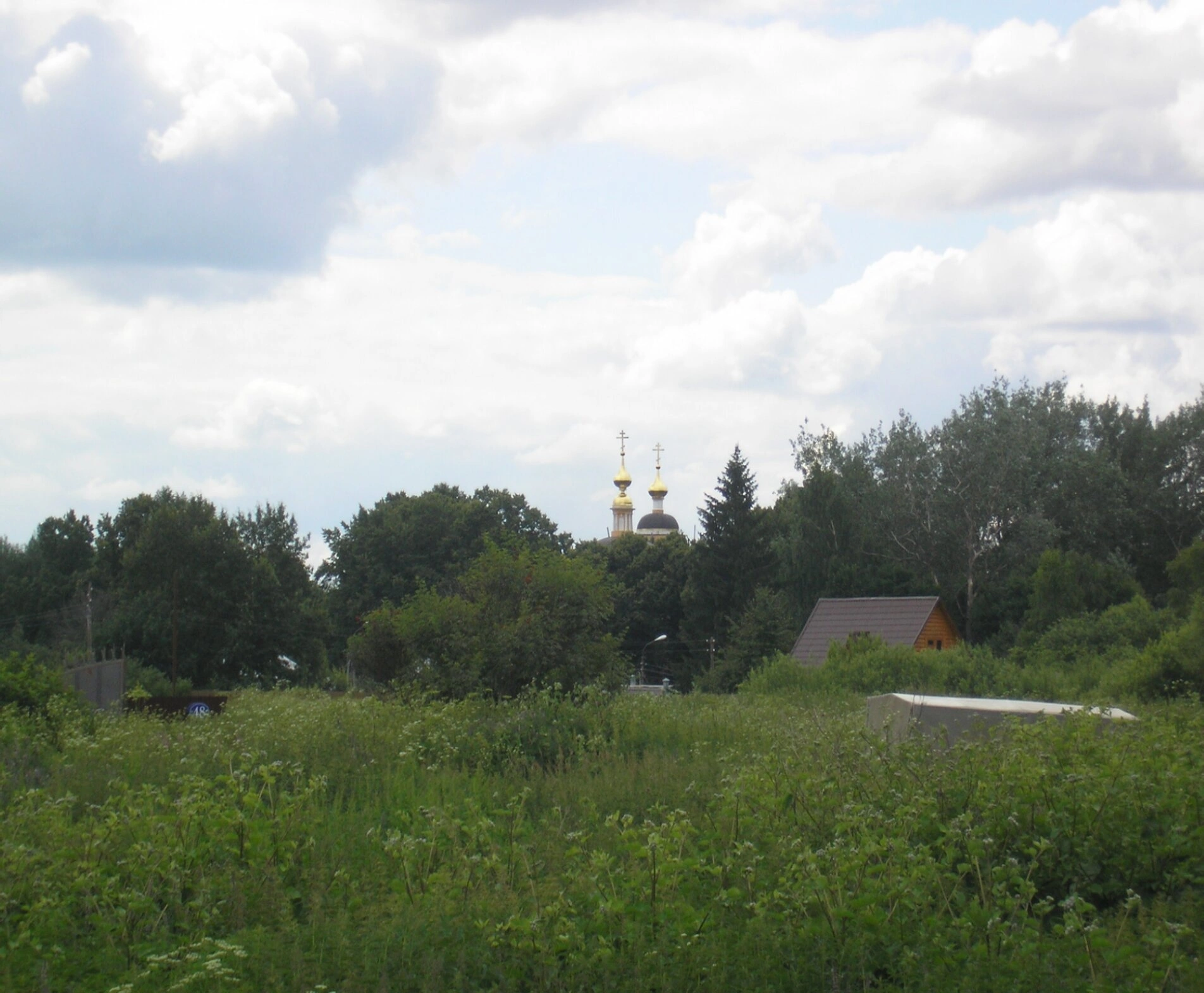 На переднем плане изображения простирается заросший луг с высокой травой и дикорастущими кустарниками, что придаёт сцене ощущение умиротворённости и единения с природой. Средний план частично скрывает деревья и хозяйственные постройки, создавая естественное обрамление для главного объекта съёмки.