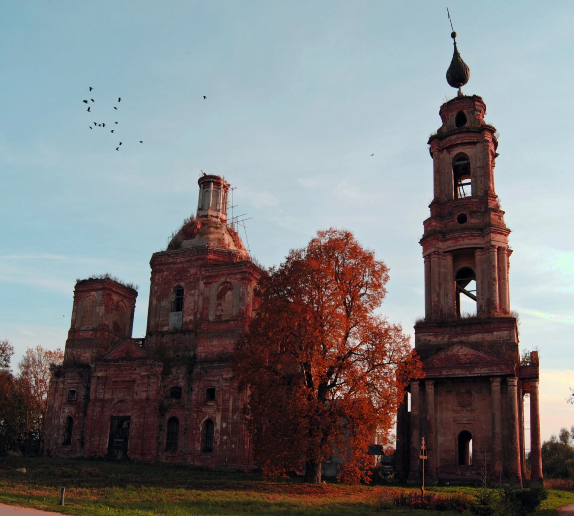 Окружает святое место осенняя природа: пожухлая трава, оголённые деревья и большое дерево с пожелтевшей листвой, расположившееся между храмом и колокольней. На переднем плане видна грунтовая дорога, ведущая к храму. Над всем этим печальным, но оттого не менее возвышенным пейзажем, в небесной выси парят птицы, символизируя надежду на возрождение и вечную жизнь.