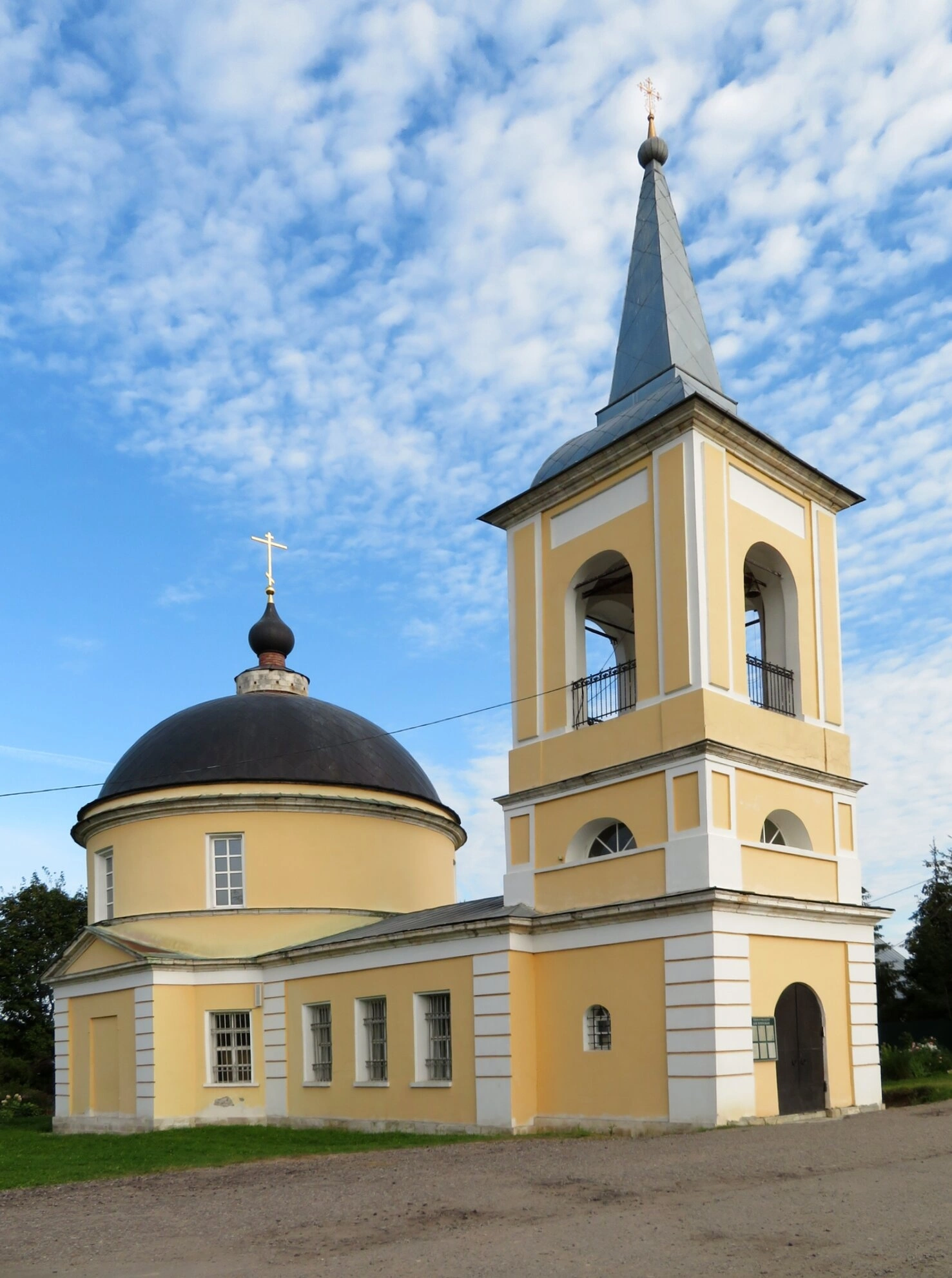 Основной объём церкви выполнен в форме монументальной ротонды, увенчанной сферическим куполом тёмного цвета. Купол венчает изящный барабан с традиционной луковичной главкой, над которой возвышается православный крест. Фасад здания окрашен в тёплый жёлтый цвет, который гармонично сочетается с белоснежными архитектурными деталями: рустом на углах, наличниками окон, карнизами и цоколем. Прямоугольные оконные проёмы с белыми рамами добавляют фасаду строгость и ритмичность.