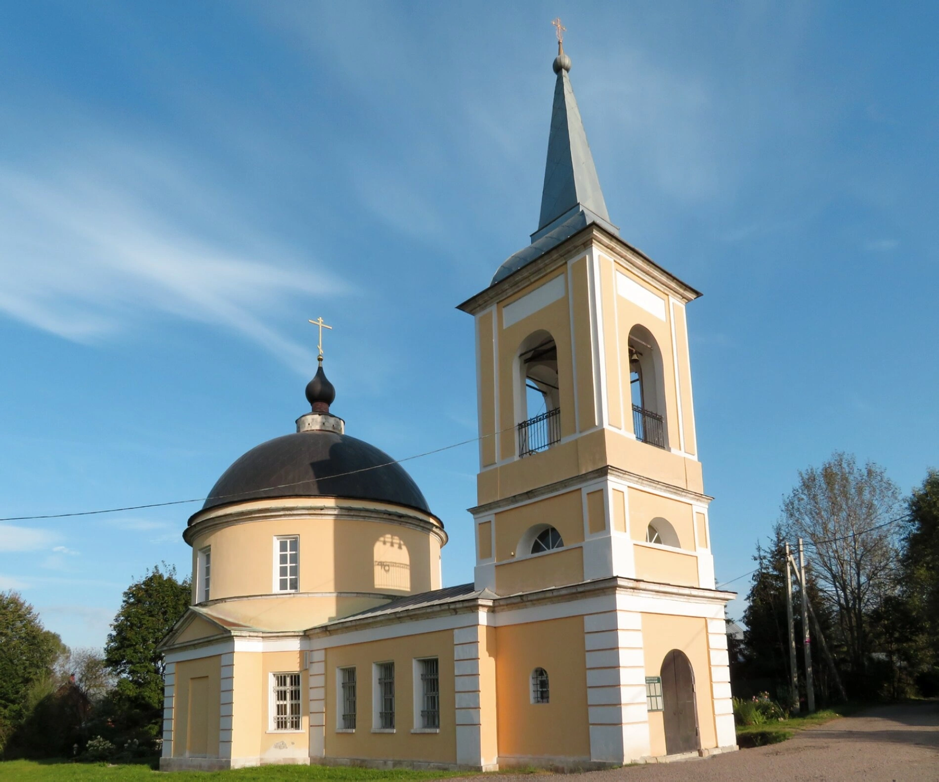 Основной объём храма увенчан полусферическим куполом чёрного цвета, на котором гордо установлен православный крест. К нему примыкает стройная многоярусная колокольня, завершающаяся остроконечным шпилем. Фасады здания окрашены в тёплый жёлтый цвет, который гармонично сочетается с белоснежным декором: оформлением углов, наличниками окон и карнизами. Такая цветовая гамма характерна для русской храмовой архитектуры периода классицизма.