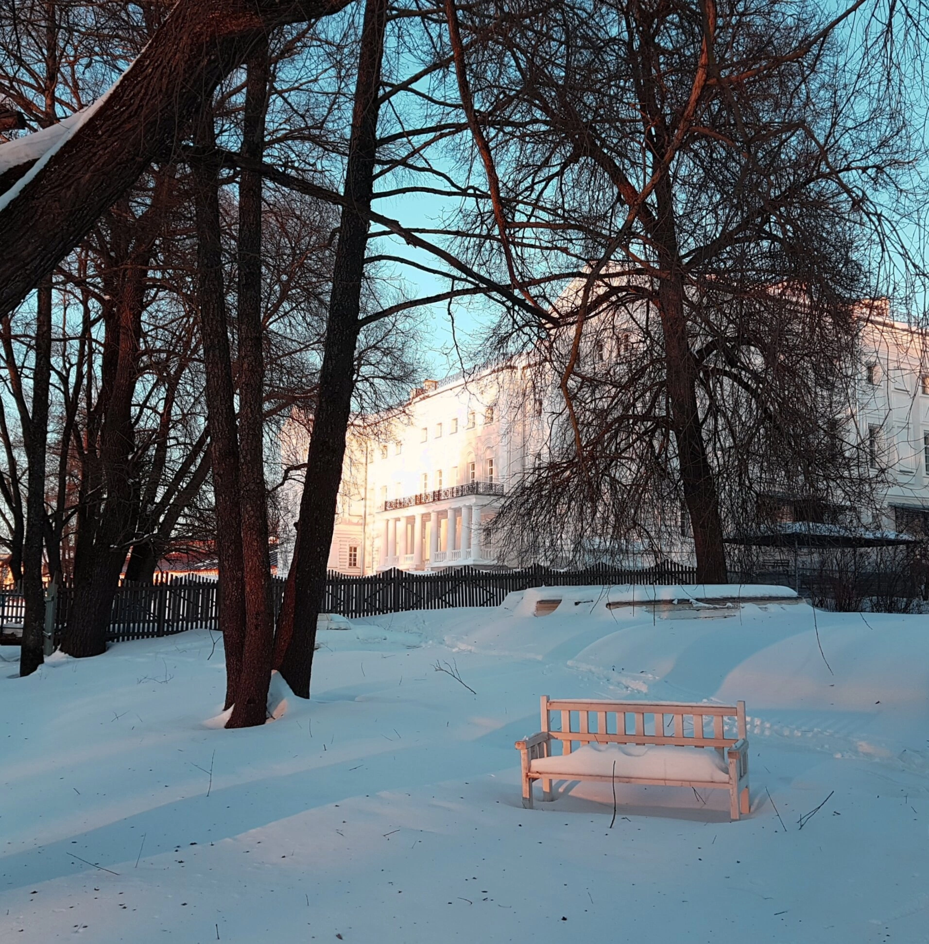 На переднем плане фотографии находится деревянная скамейка, щедро украшенная пушистым снегом. За ней простирается заснеженный парк с деревьями, склонившими под тяжестью снежного одеяния свои голые ветви. Через ажурные ветви просматривается ограждение храмовой территории и глубокие сугробы, искрящиеся в лучах зимнего солнца.