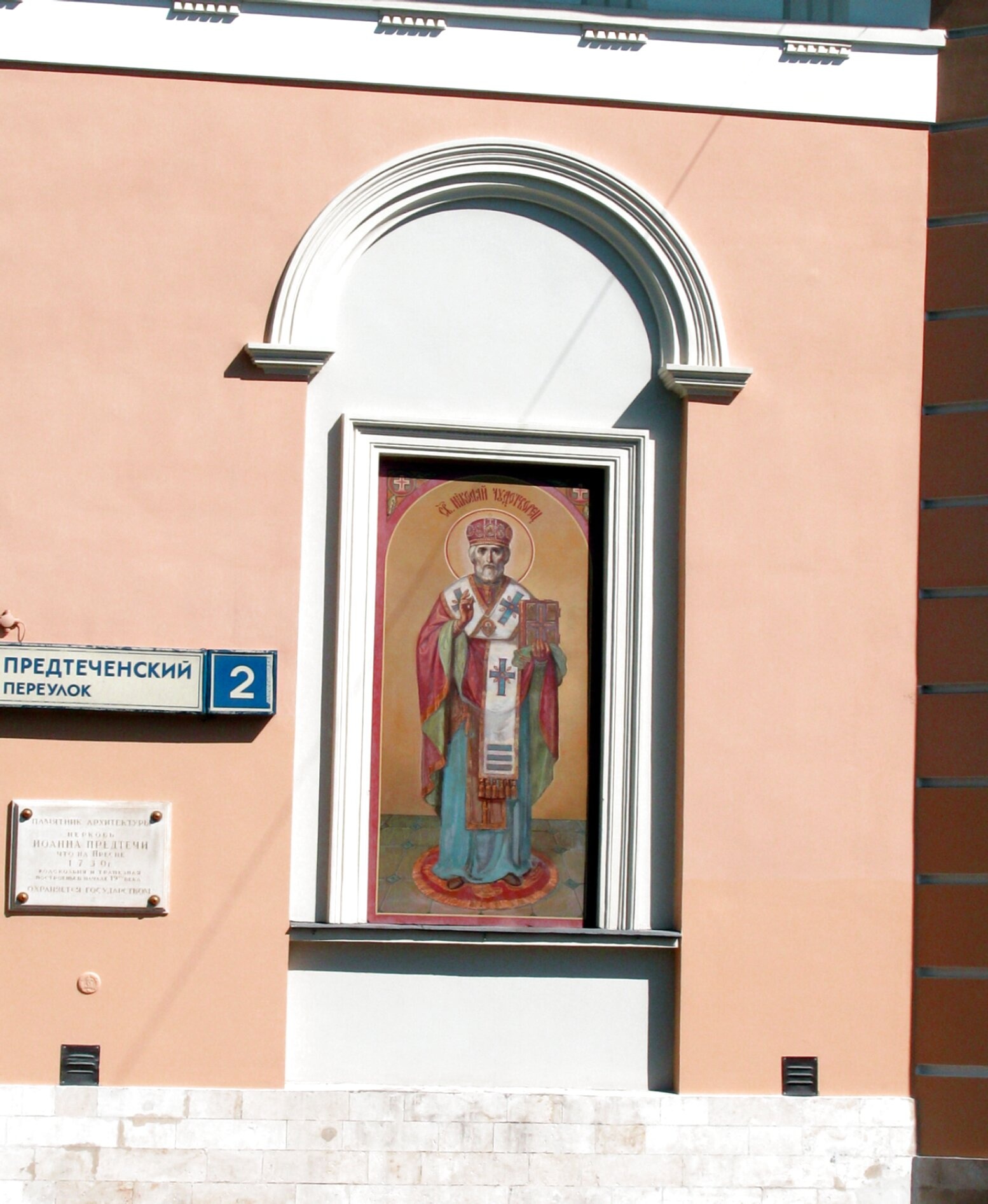 Слева от оконного проема размещен синий указатель с надписью «Й ПРЕДТЕЧЕНСКИЙ» и номером дома «2», что указывает на историческое название переулка, связанное с посвящением храма. Ниже расположена мемориальная табличка, содержание которой, к сожалению, не полностью видно на снимке, но которая, несомненно, хранит память о важных событиях в истории прихода.