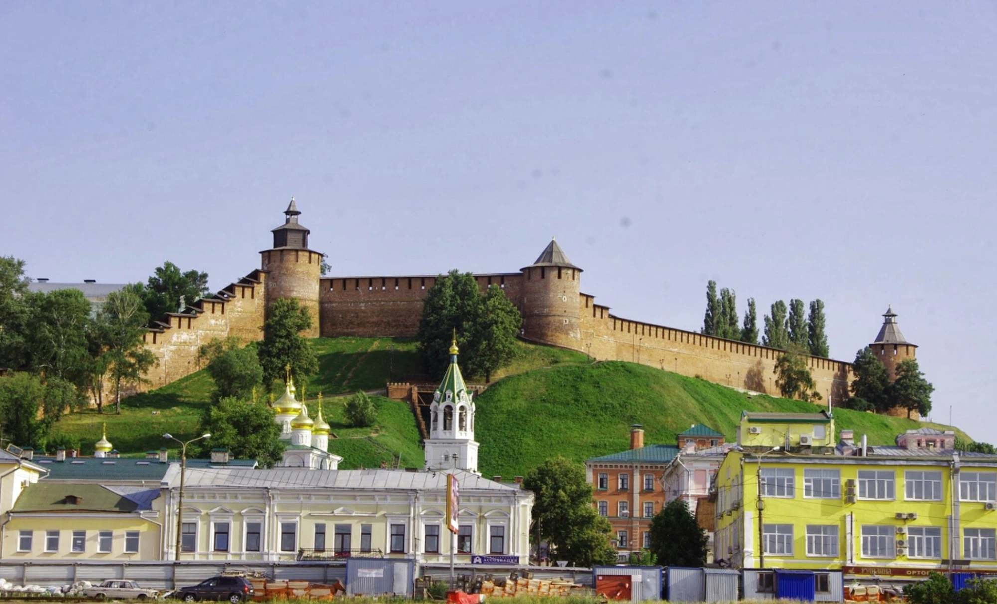 На представленной фотографии запечатлён величественный храм в честь Рождества святого славного пророка, Предтечи и Крестителя Господня Иоанна, расположенный у подножия Нижегородского кремля в историческом центре города. Этот православный храм, освящённый в честь небесного покровителя всех православных христиан, имеет глубокое духовное и историческое значение для всего нижегородского края.