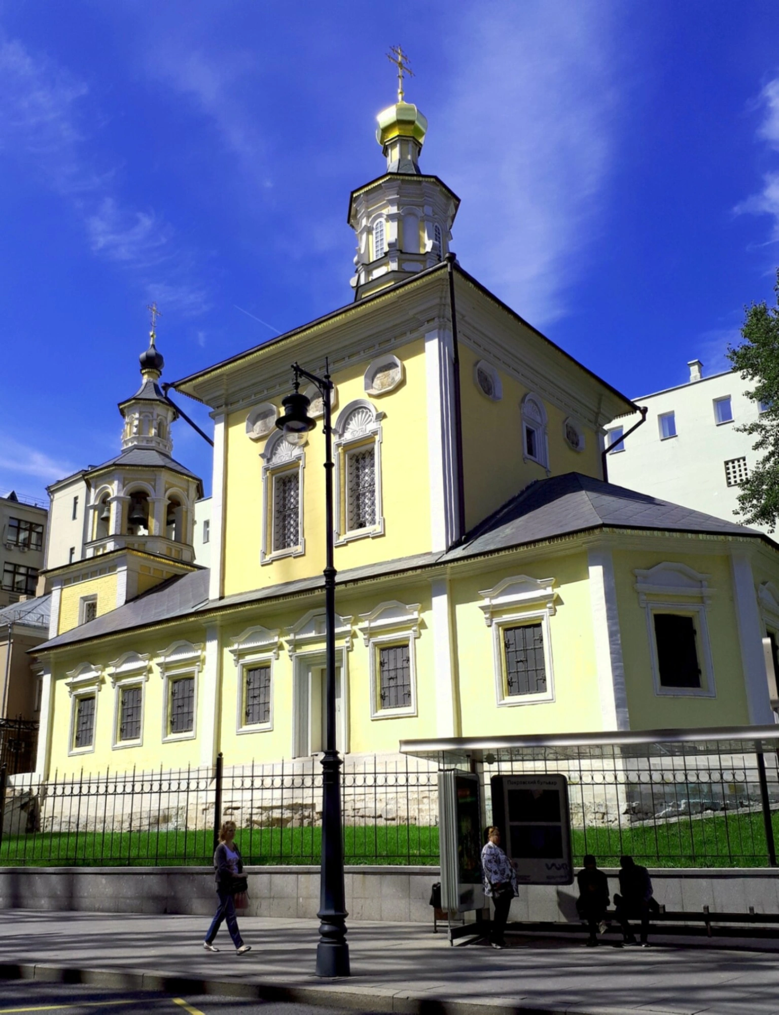 Храм гармонично вписан в городской ландшафт Китай-города. На снимке хорошо виден его нарядный фасад, выкрашенный в тёплые желтые тона и украшенный белоснежными архитектурными деталями, что создаёт ощущение лёгкости и величия одновременно. Венчают храм золочёные купола, сияющие в лучах солнца, и стройная колокольня, устремлённая в небо.