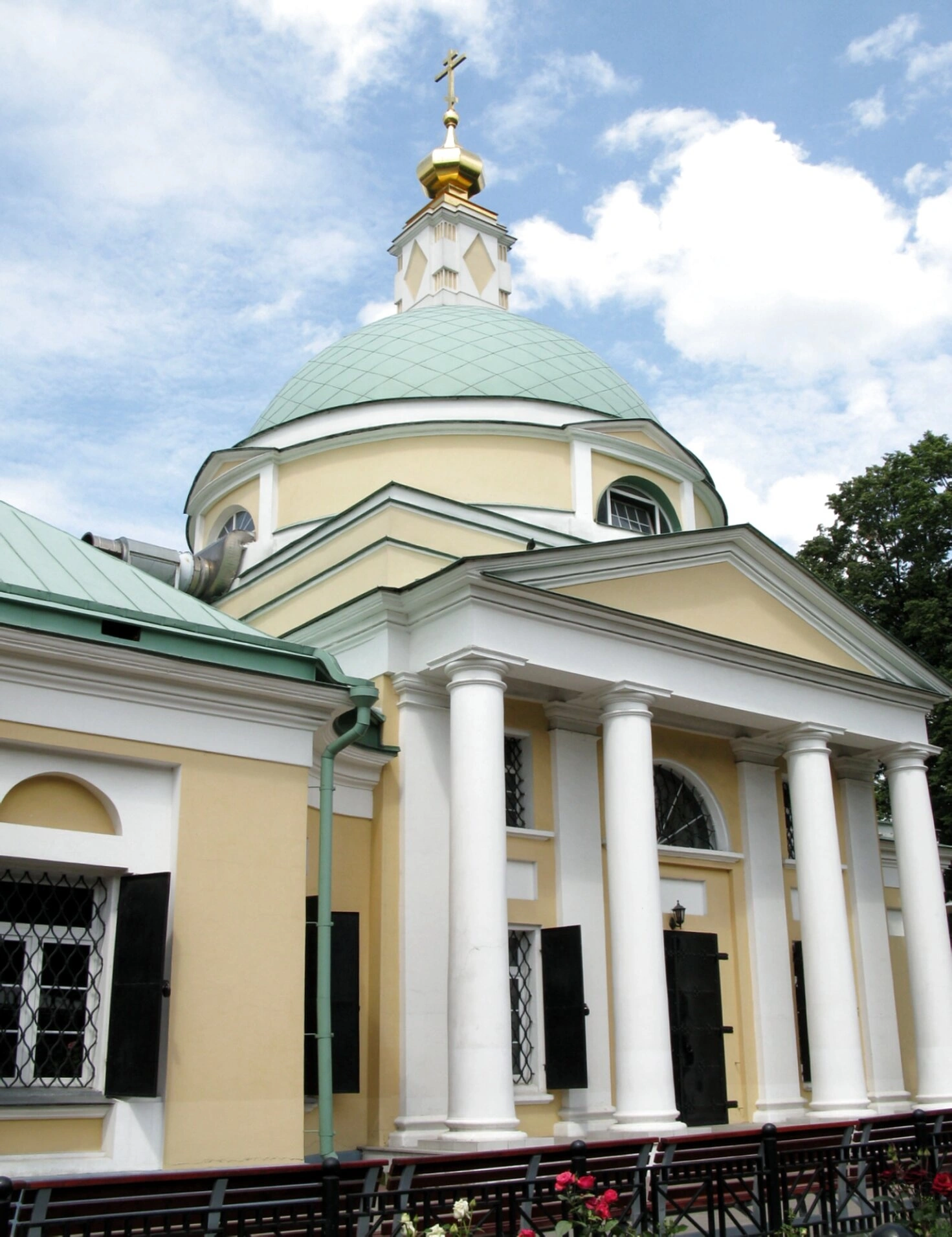 На снимке изображён прекрасный образец церковного зодчества, выполненный в каноническом русско-византийском стиле. Фасад храма, выдержанный в тёплых жёлтых тонах и украшенный белоснежными декоративными элементами, смотрится нарядно и благолепно. Центральную часть композиции венчает массивный зелёный купол, символизирующий небесную сферу и увенчанный златым крестом – символом нашего спасения. Главный вход акцентирован монументальным портиком с колоннами, что придаёт всему облику храма величие и торжественность.