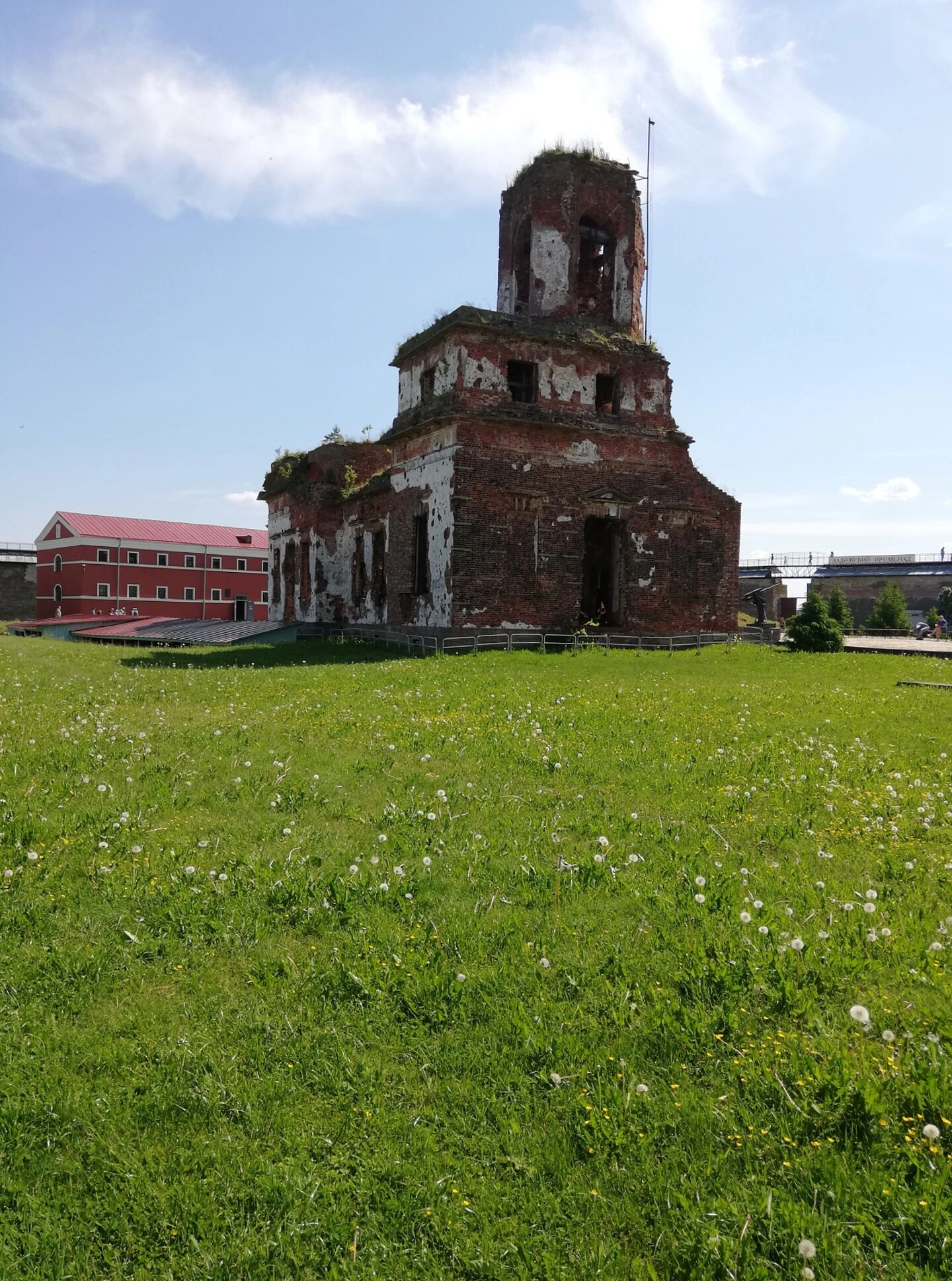 На фотографии запечатлён храм Рождества Иоанна Предтечи, расположенный в древней крепости Орешек на Ореховом острове. Это величественное сооружение, пребывающее ныне в руинированном состоянии, является немым свидетелем героической и трагической истории этого места.