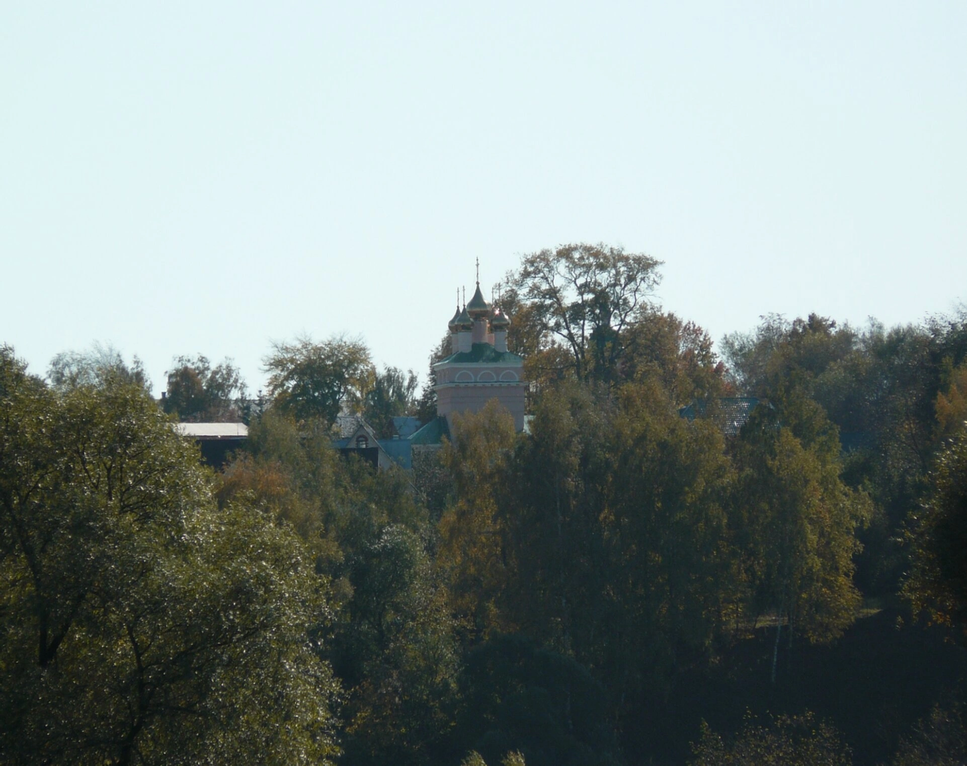 На представленной фотографии запечатлён живописный вид на Церковь Рождества Святого Иоанна Предтечи в городе Малоярославце Калужской области. Снимок сделан с Медвежьего луга в октябре, что придаёт пейзажу особое очарование осенних красок. Храм гармонично вписан в природный ландшафт, его светлые стены и зелёные кровли главок ярко выделяются на фоне золотистой листвы и густой зелени хвойных деревьев.