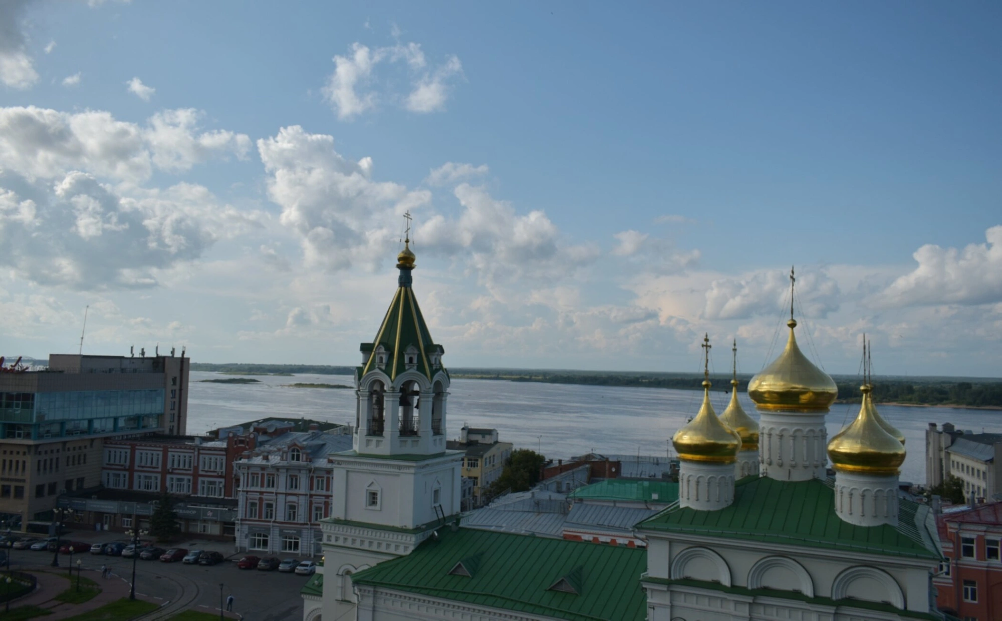 На представленной фотографии запечатлён величественный храм Рождества честного славного Пророка, Предтечи и Крестителя Господня Иоанна, что у подножия Ивановской башни Нижегородского кремля. Это один из древнейших и наиболее почитаемых православных храмов Нижнего Новгорода, чья история неразрывно связана с судьбой самого города.