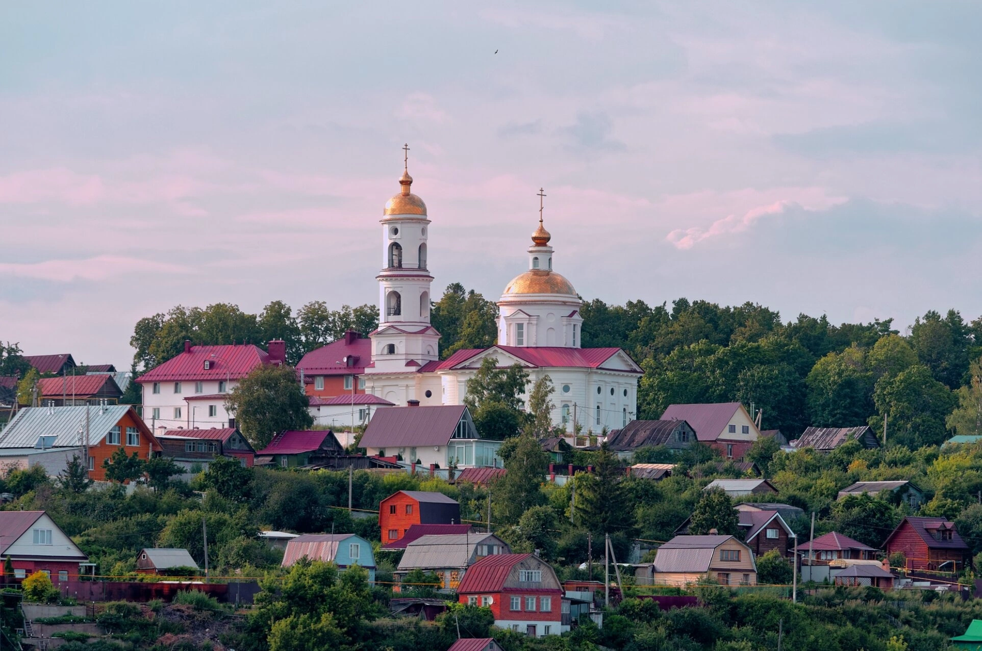 На фотографии храм предстаёт в своём архитектурном благолепии. Здание представляет собой образец классического стиля с элементами ампира, характерного для рубежа XVIII–XIX веков. Основной объём церкви увенчан крупным центральным куполом, а рядом высится стройная многоярусная колокольня, завершённая малым куполом. Их белизна и позолота ярко выделяются на фоне зелени и неба с лёгкими облаками. Снимок передаёт умиротворённую атмосферу православного сельского прихода, гармонично вписанного в природный ландшафт и жизнь села, дома которого сгруппированы на склонах холма.