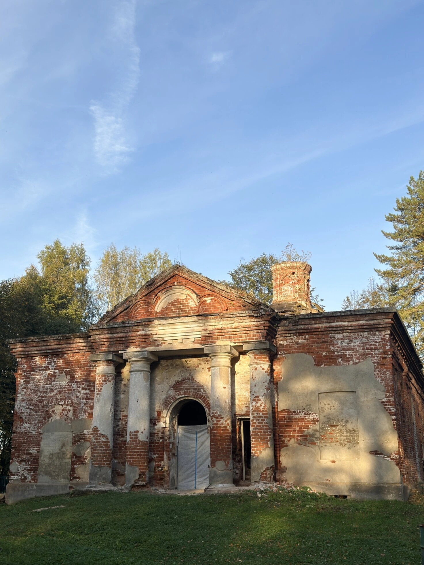 Здание церкви представляет собой образец русской храмовой архитектуры, выполненный из красного кирпича. На фотографии видны характерные элементы церковного зодчества: арочные оконные проёмы, декоративные колонны, сохранившиеся фрагменты карниза и киот над одним из входов. Несмотря на следы разрушения и обветшания, в облике храма угадывается былое величие и благолепие.