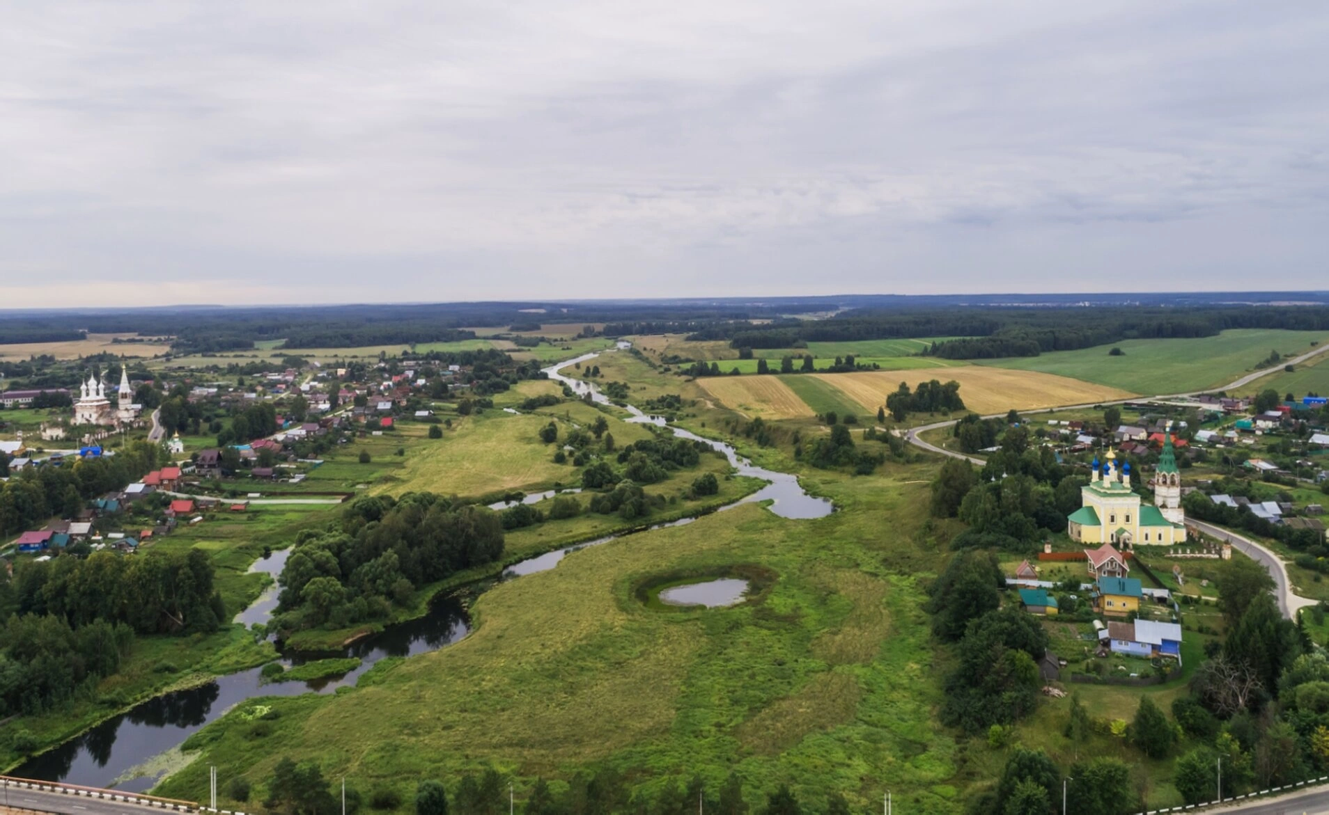 На снимке также видна дорожная инфраструктура, включающая мост, что указывает на связь деревни с внешним миром. Присутствие двух храмовых строений на фотографии говорит о богатом историческом и духовном наследии этого края. Данный вид позволяет зрителю ощутить атмосферу русской глубинки, где вековые православные традиции неразрывно связаны с природной гармонией и тишиной.