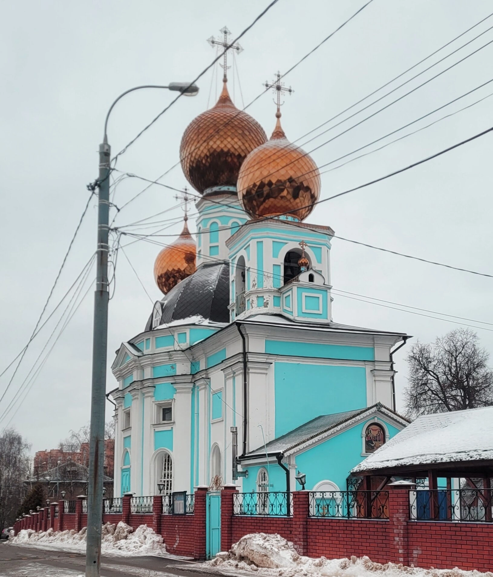 Храм гармонично вписан в окружающий деревенский ландшафт. На переднем плане фотографии виднеется часть улицы, кирпичное ограждение и фонарный столб, а нетронутый снежный покров подчёркивает тихую и умиротворённую атмосферу этого святого места в холодное время года. Снимок передаёт особое состояние благоговейного спокойствия, свойственное православным обителям.