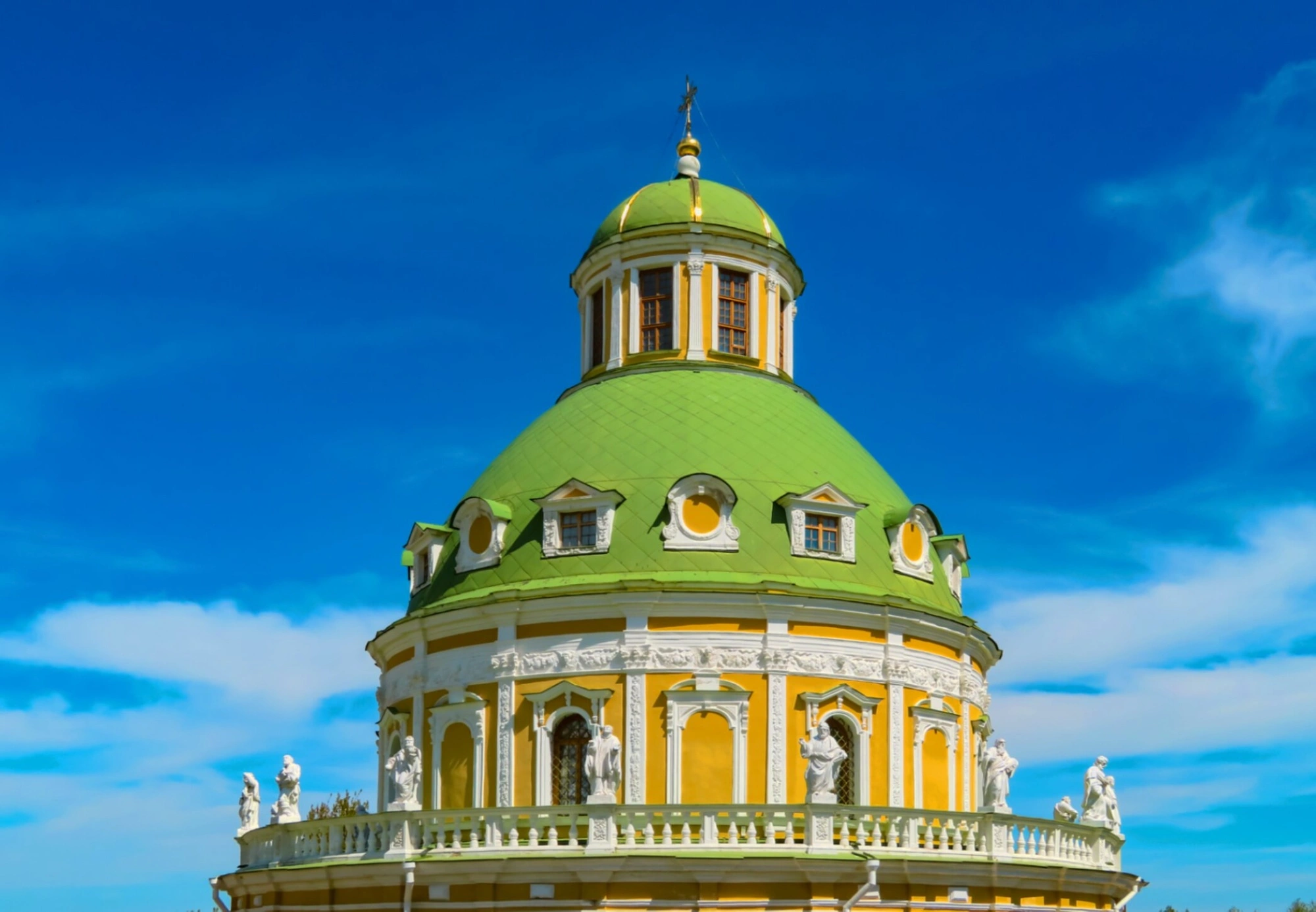 Архитектурный облик храма представляет собой редкий для русского зодчества тип ротонды, окружённой открытой аркадой. Храм выполнен в стиле Голицынского барокко, для которого характерно сочетание европейских барочных форм с традиционными русскими подходами к объёмно-пространственной композиции. Здание увенчано мощным зелёным куполом, который покоится на высоком световом барабане, что усиливает ощущение монументальности и устремлённости ввысь.