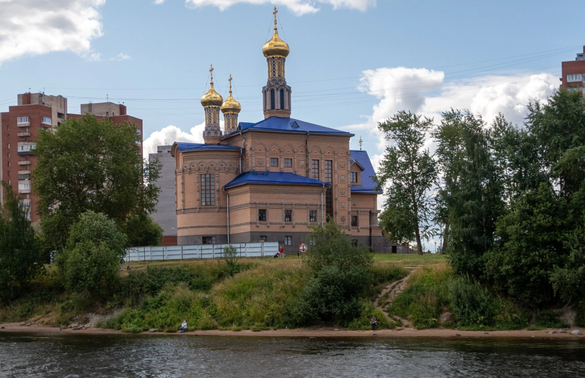 На фотографии запечатлён величественный храм в честь Рождества Пресвятой Богородицы, расположенный в историческом районе Рыбацкое на востоке Санкт-Петербурга. Белоснежный пятиглавый собор с золотыми куполами и высокой колокольней является архитектурной доминантой набережной реки Невы.