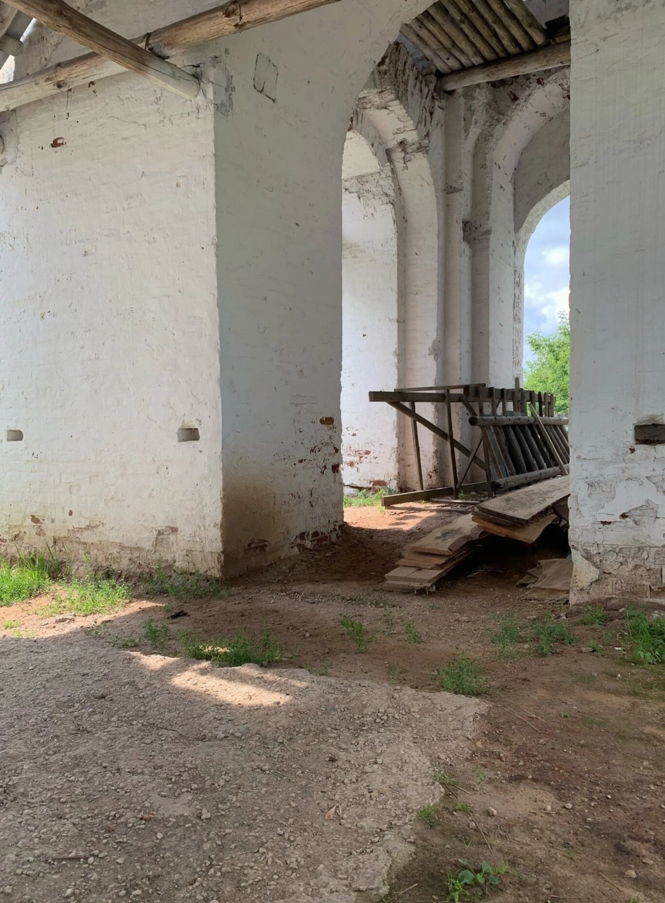 На фотографии запечатлён интерьер Церкви Рождества Пресвятой Богородицы, древнейшего храма Городищенского района. Монументальные белые колонны и мощные своды, поддерживаемые деревянными балками, свидетельствуют о традициях церковного зодчества. Состояние внутреннего убранства отражает сложную историю святыни: облупившаяся штукатурка, обнажающая кирпичную кладку, и элементы строительных лесов говорят о периоде забвения и последующих восстановительных трудах.