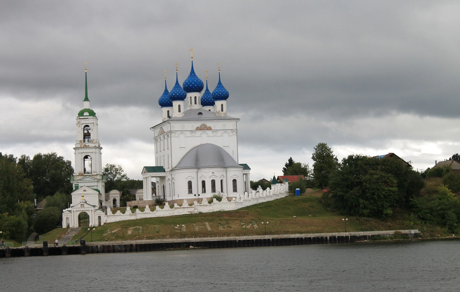 На фотографии запечатлён величественный храм в честь Рождества Пресвятой Богородицы, расположенный в старинном селе Катунки Чкаловского района Нижегородской области. Святыня живописно возвышается на крутом берегу Горьковского водохранилища, у слияния рек Санахты и Волги, создавая неповторимый архитектурный образ и являясь духовным символом этих мест.