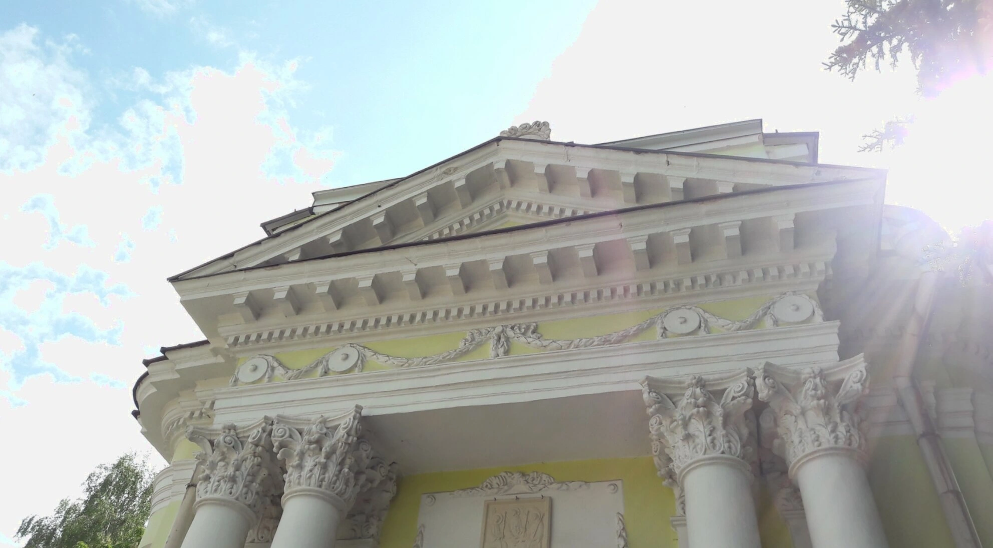 Фронтон портика украшен лепным декором, под которым расположен фриз с тонким растительным орнаментом. Цветовое решение фасада выдержано в благородной гамме: стены окрашены в теплый светло-желтый цвет, а архитектурные детали — колонны, карнизы и декоративные элементы — выделены белым, что создает эффект объемности и парадности.