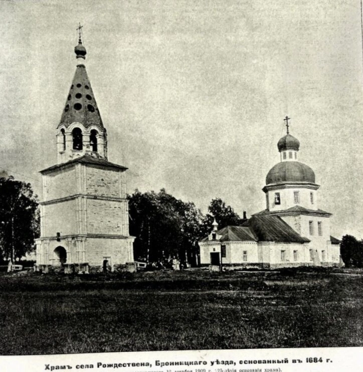 На исторической фотографии, датируемой приблизительно 1909 годом, запечатлён храм в честь Рождества Пресвятой Богородицы, расположенный в селе Рождествено Бронницкого уезда Московской губернии (ныне — Раменский городской округ Московской области). Святыня была основана в 1684 году, а данный снимок был приурочен к знаменательной дате — 225-летию со дня основания храма.