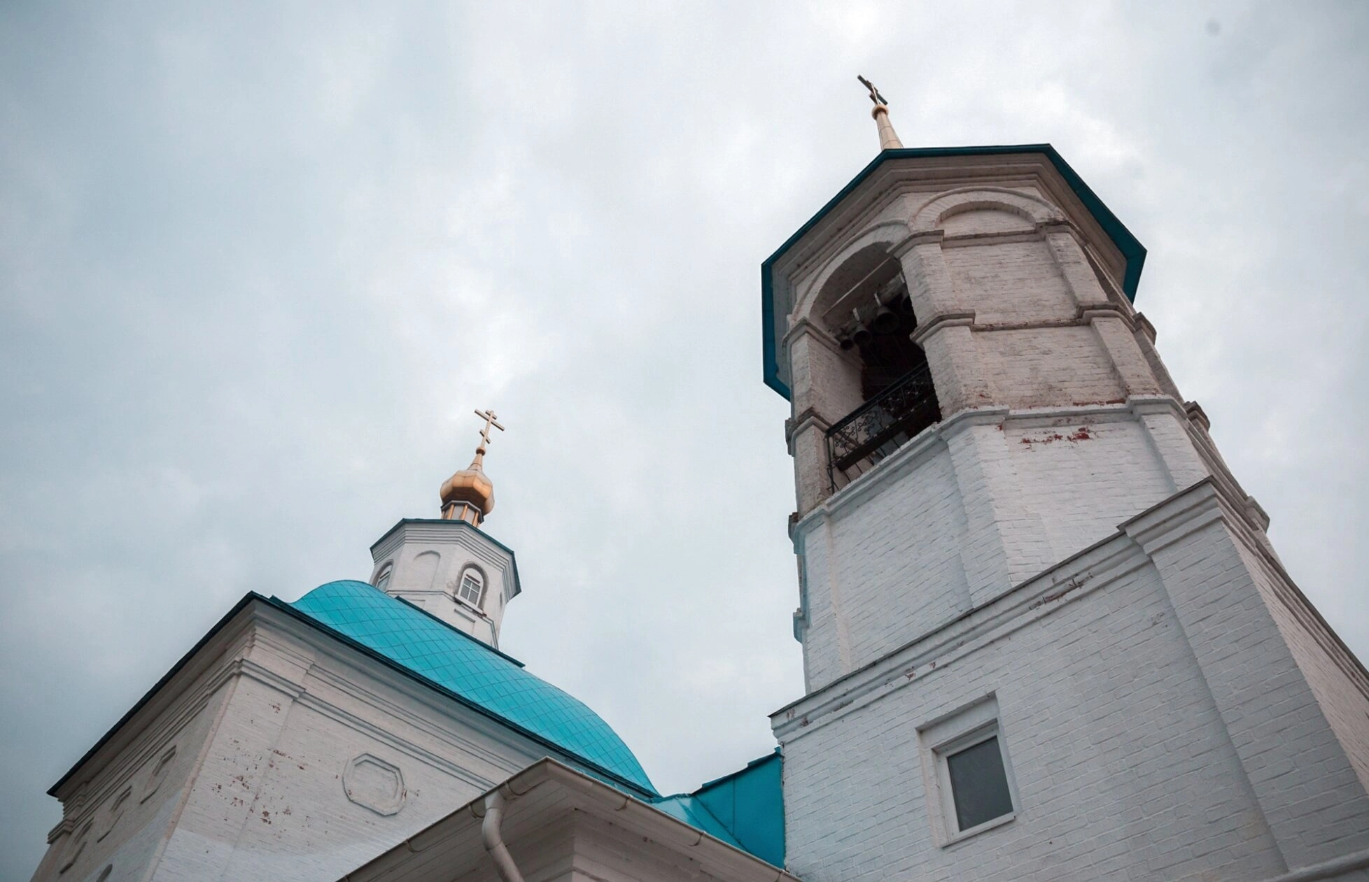 Белокаменный храм с синими, увенчанными златоглавыми крестами куполами представляет собой прекрасный образец русского церковного зодчества. На снимке видна часть светлого фасада здания и шатровая колокольня, гармонично составляющая с ним единый архитектурный ансамбль. Церковь излучает благодать и спокойствие, являясь не только духовным центром, но и важным историко-культурным памятником.