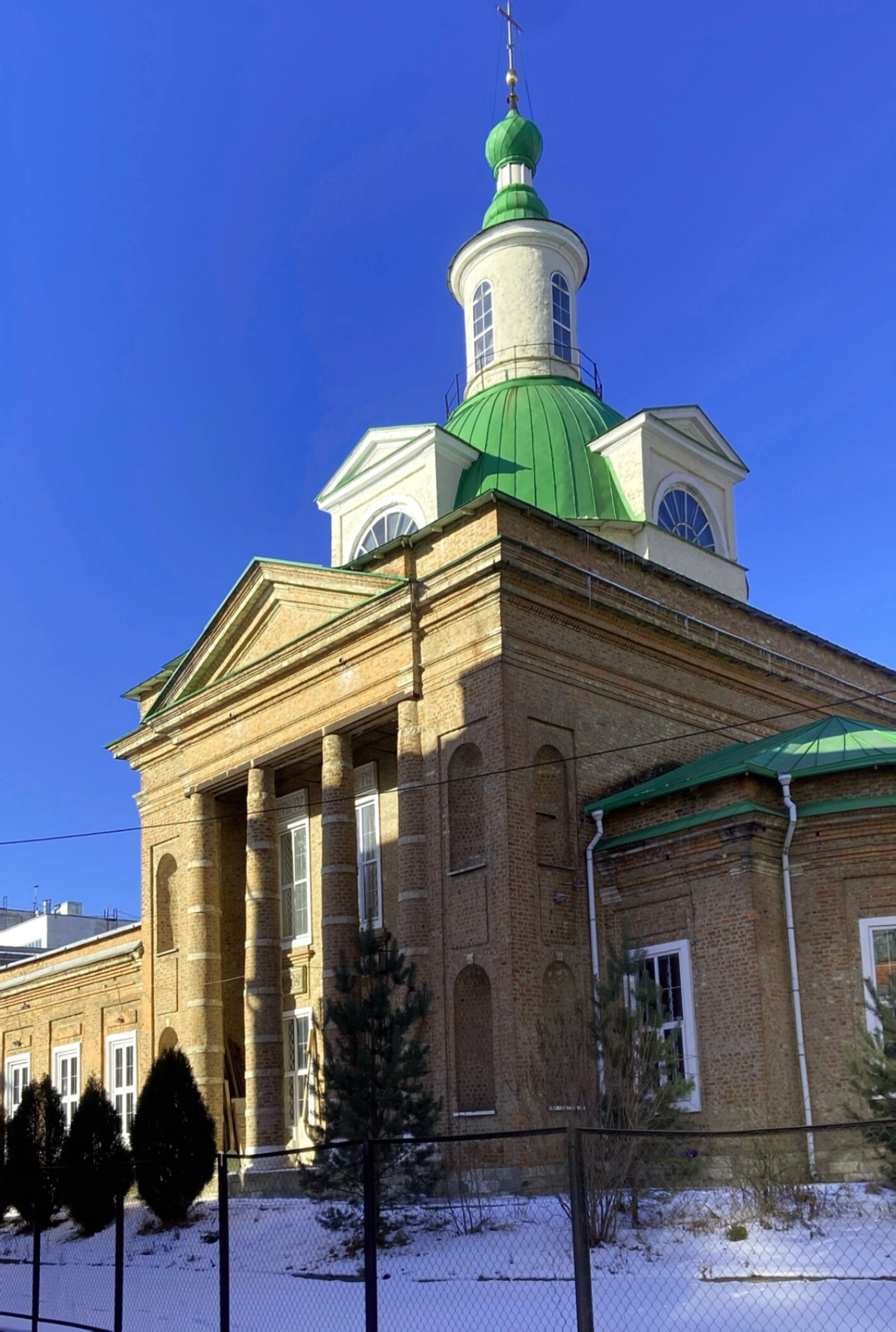 Зимнее убранство придаёт церковному ансамблю особую благодать и умиротворение. Снег покрывает землю и ограду, оттеняя насыщенный цвет кирпичных стен, а хвойные деревья по краям кадра добавляют пейзажу живости и красок. Храм Рождества Богородицы является не только архитектурным памятником, но и действующим православным приходом, несущим веру и духовное утешение жителям города на протяжении многих десятилетий. Эта фотография передаёт тихую красоту и спокойствие святого места, приглашая каждого к молитве и благочестивым размышлениям.
