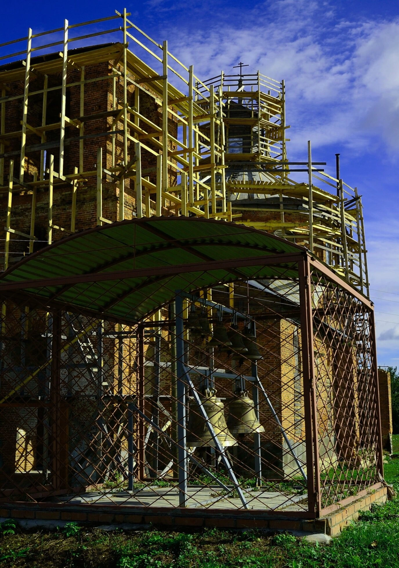 Особый интерес на переднем плане представляет временное размещение колоколов под специальным защитным навесом. Это свидетельствует о том, что колокольня храма ещё не готова к их принятию или также находится в процессе восстановления. Колокола, являющиеся голосом православного храма, терпеливо ожидают своего часа, чтобы вновь созывать верующих на молитву своим благозвучным звоном.