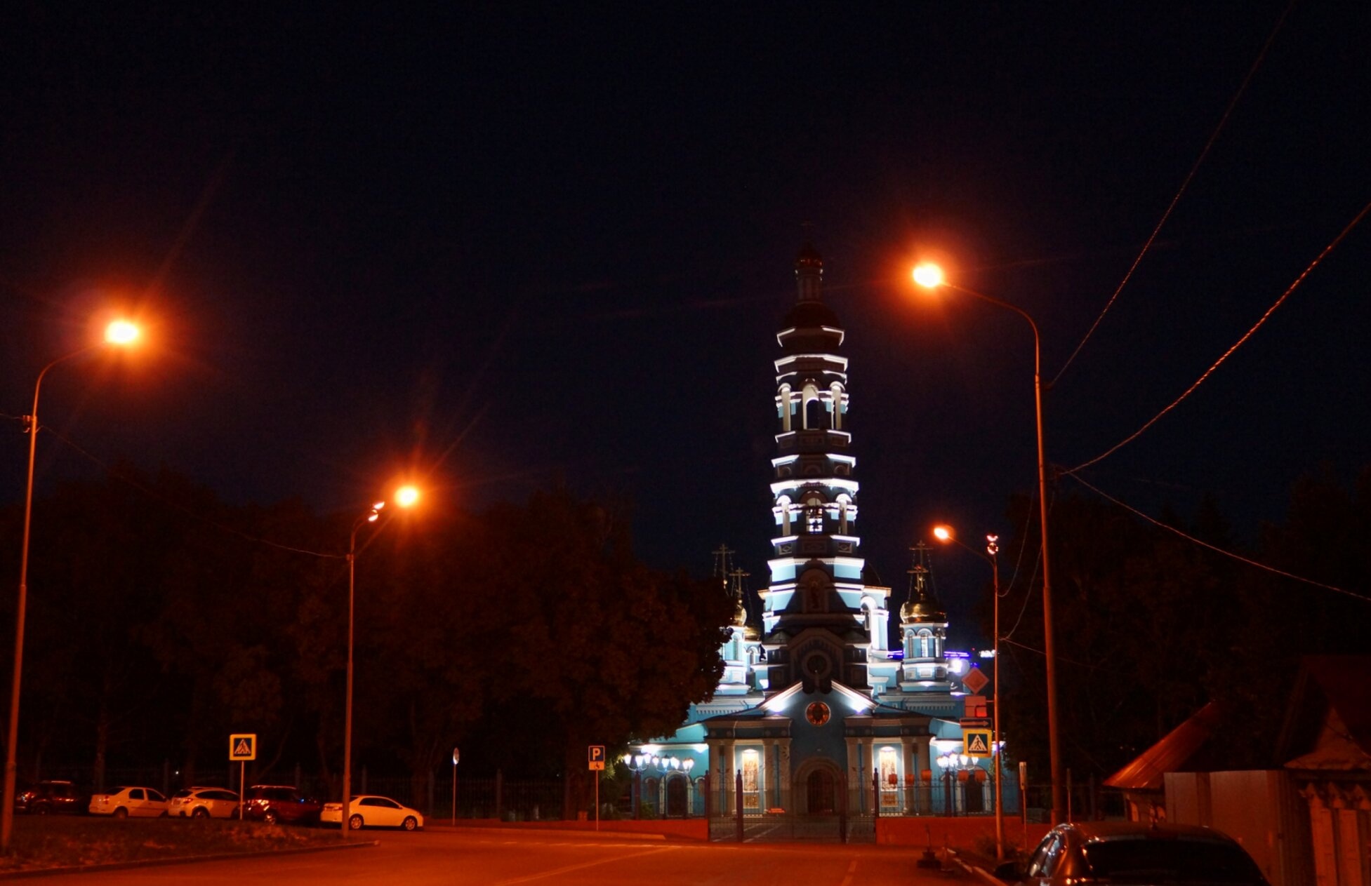 - Храм Рождества Пресвятой Богородицы в Уфе в ночной подсветке