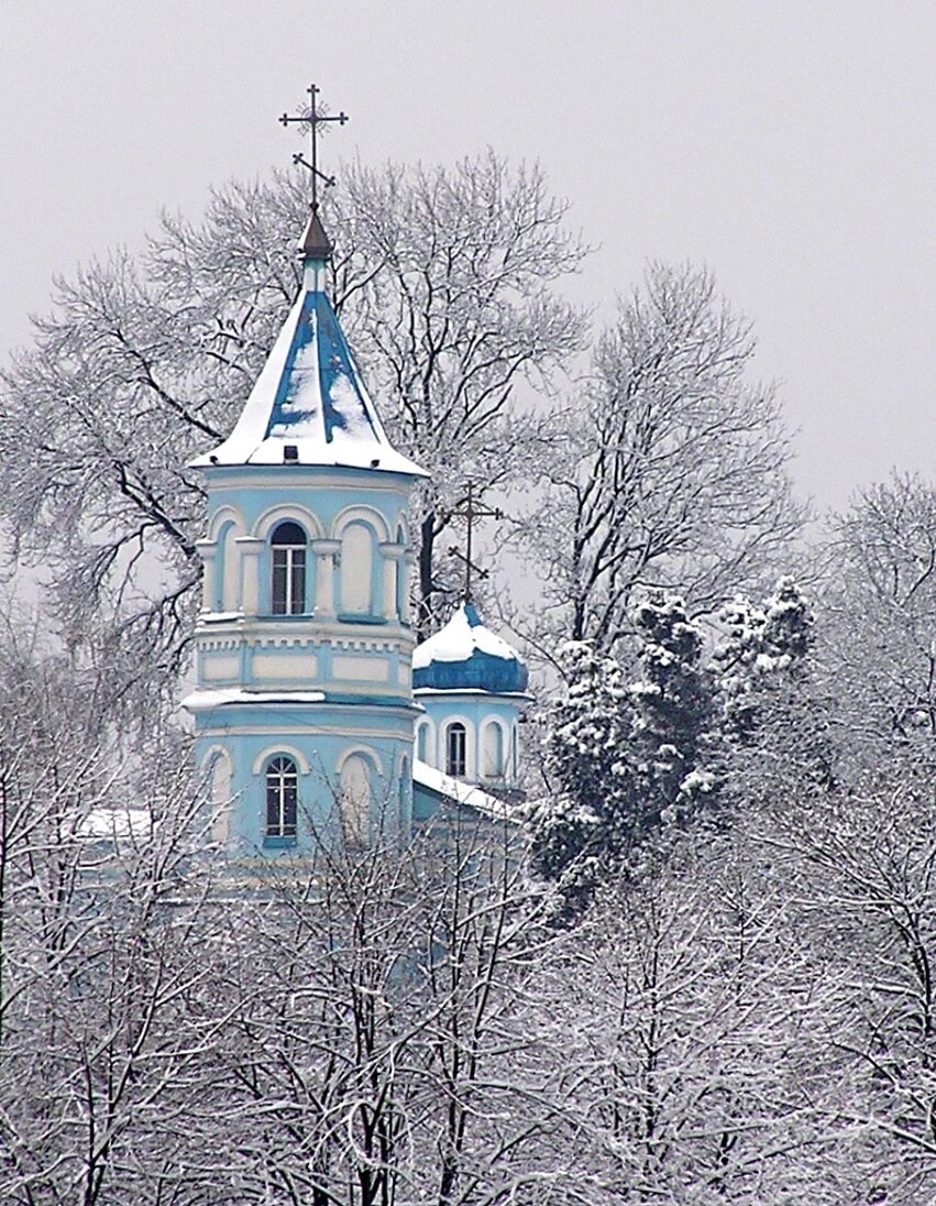 На снимке хорошо видны характерные архитектурные элементы: центральный купол небесного цвета, увенчанный золочёным крестом, стройная колокольня и симметричные фасады. В зимнее время, когда сделана фотография, храм выглядит особенно умиротворённо и величественно, приглашая верующих к молитве и созерцанию духовной красоты.