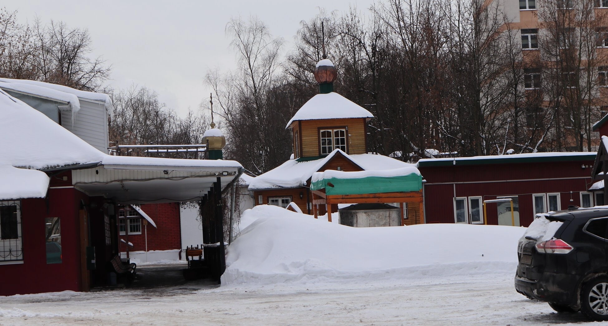 Зимний пейзаж усиливает восприятие храма как места уединённой молитвы и духовного сосредоточения. Снег покрывает кровлю здания и окружающую территорию, создавая образ чистоты и непорочности. Оголённые деревья подчёркивают суровость времени года, но храм выглядит тёплым и welcoming пристанищем для верующих.