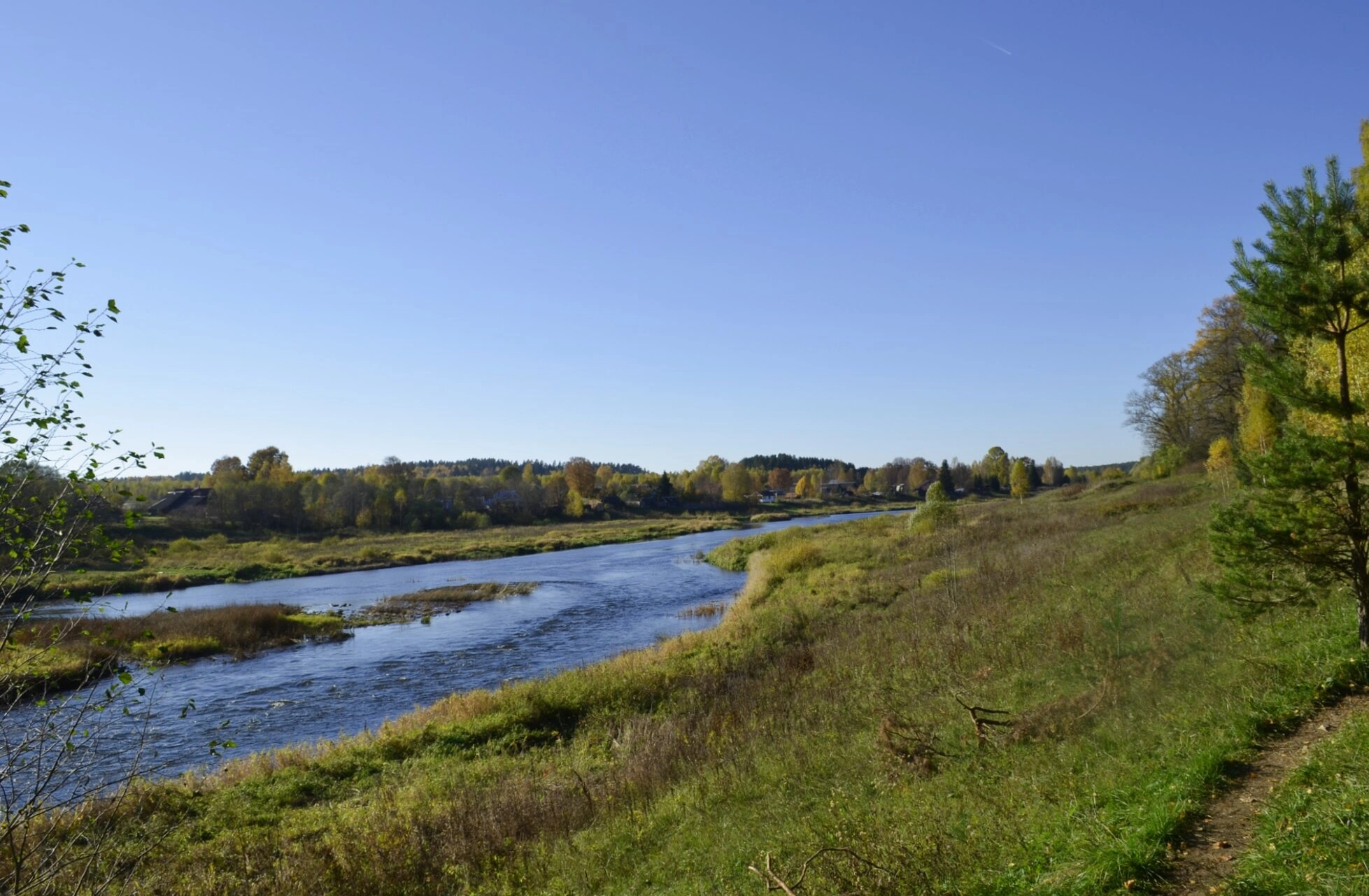 На переднем плане фотографии простирается спокойная гладь реки Тверцы, несущей свои воды мимо древних берегов, поросших луговой травой и прибрежным кустарником. Осенняя природа облачает противоположный берег в золотисто-багряный убор, сквозь который виднеются скромные деревенские строения.