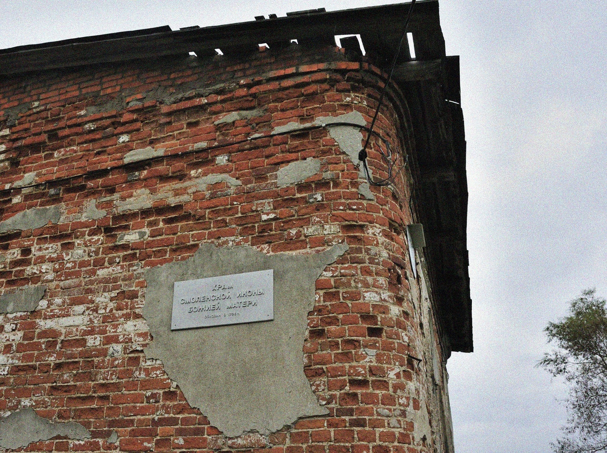 На фотографии запечатлен фрагмент стены Храма Смоленской иконы Божией Матери, расположенного в селе Ильинское Кимрского района Тверской области. Чётко читаемая табличка с наименованием храма однозначно свидетельствует о принадлежности сооружения к православной святыне, освящённой в честь чудотворного Смоленского образа Пресвятой Богородицы.