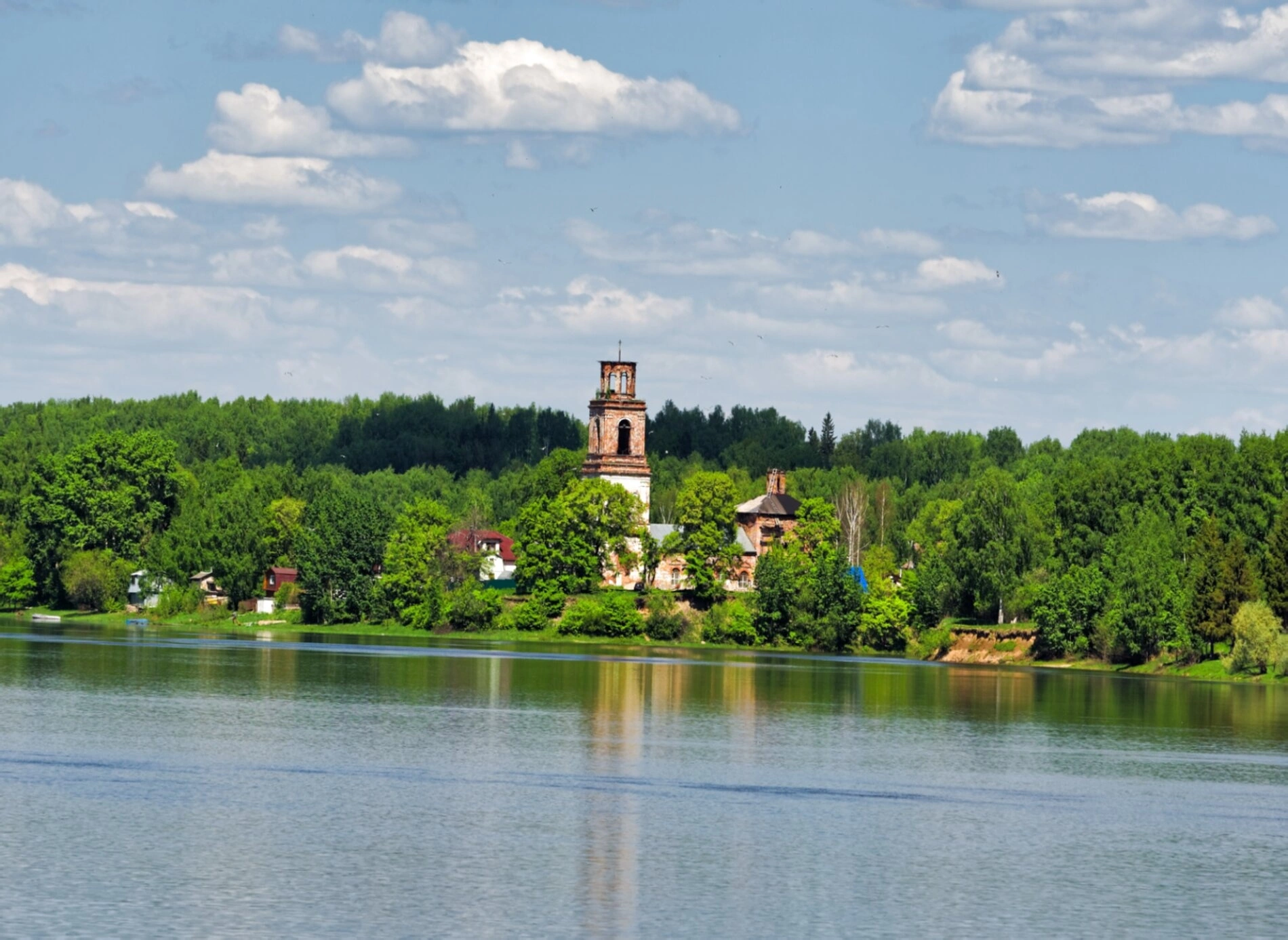Храм гармонично вписан в природный ландшафт. Его светлые стены и синие купола, увенчанные златоглавыми крестами, отражаются в спокойных водах реки, создавая ощущение неземного благолепия и божественной гармонии. Снимок передаёт умиротворяющую атмосферу этого святого места, окружённого густой зеленью деревьев и бескрайними лесными просторами.
