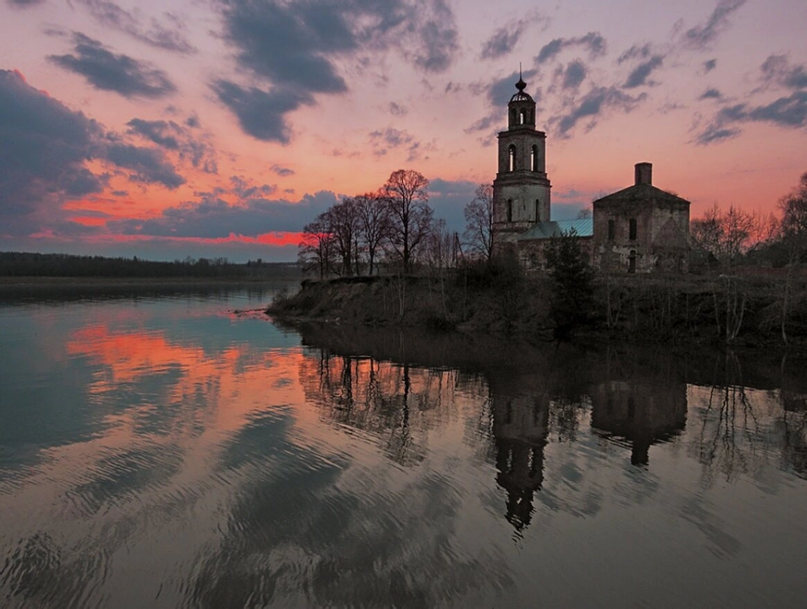 На представленной фотографии запечатлён величественный образ храма в честь Смоленской иконы Божией Матери, что расположен в старинном селе Устье Ярославской области. Снимок сделан в час весеннего заката, когда последние лучи солнца озаряют главы и стены святыни, создавая умиротворённую и одновременно торжественную атмосферу. Золотистые отблески на водной глади реки, у которой стоит церковь, усиливают ощущение Божественного присутствия и вечной красоты православной архитектуры.