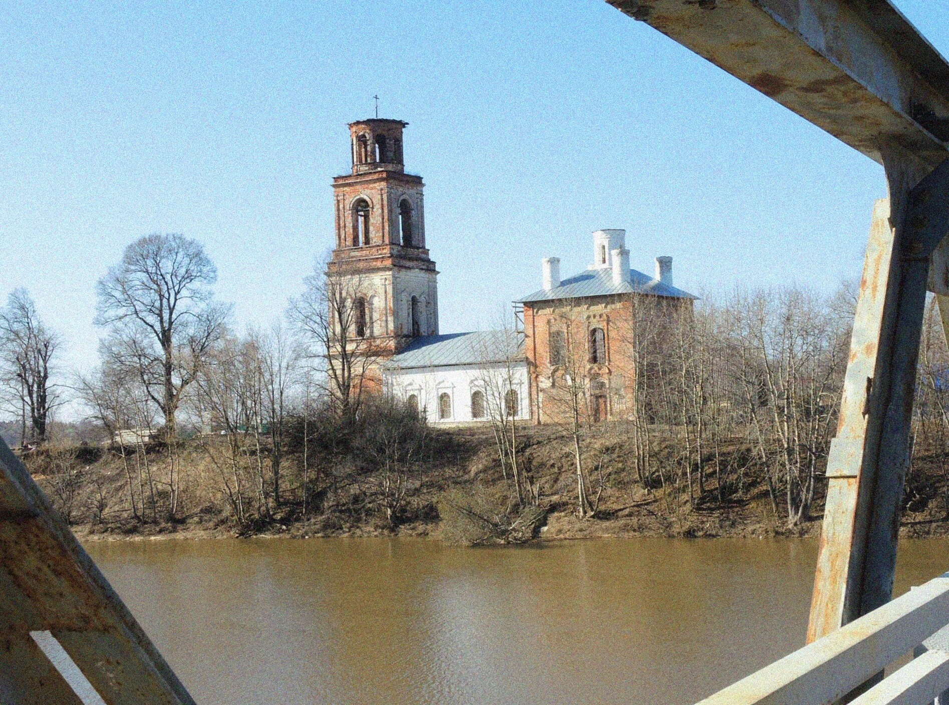 Архитектурный ансамбль состоит из двухпрестольной церкви и высокой шатровой колокольни, соединённых трапезной частью. Основной объём храма, увенчанный пятиглавием, и стройная колокольня являются яркими примерами русского церковного зодчества. Снимок сделан, предположительно, с моста через реку Устье, что позволяет оценить монументальность сооружения в его природном окружении.
