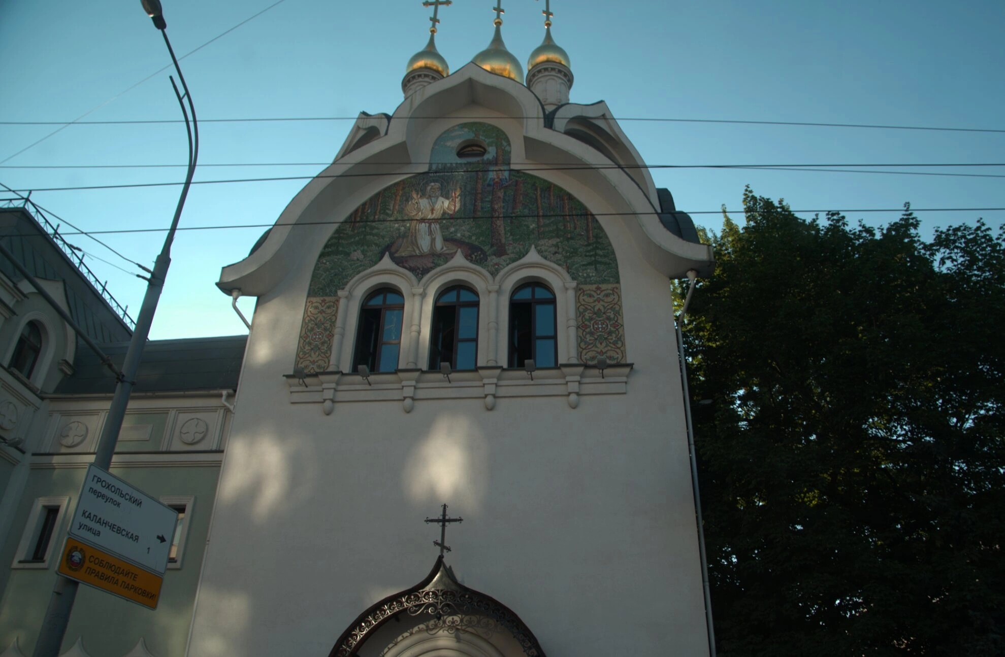 На фотографии запечатлён храм Собора Дивеевских Святых, являющийся подворьем Свято-Троицкого Серафимо-Дивеевского женского монастыря в Москве. Святыня расположена по адресу: проспект Мира, дом 22а, на пересечении с Грохольским переулком и Каланчёвской улицей.