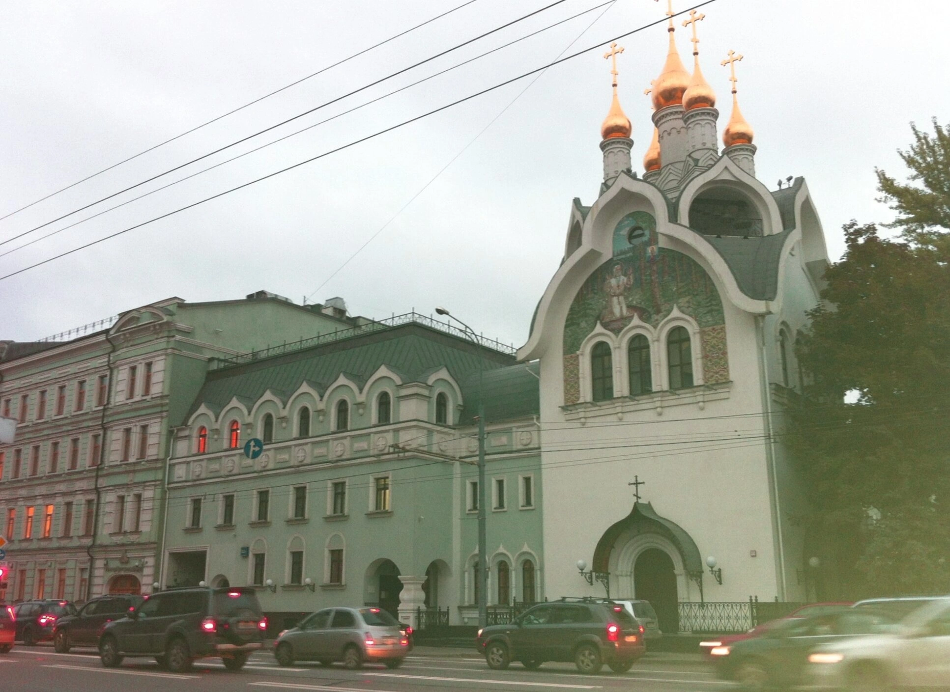 На фотографии запечатлён Храм Собора Дивеевских Святых, являющийся частью Патриаршего подворья Свято-Троицкого Серафимо-Дивеевского женского монастыря в Москве. Белоснежный храм с сияющими золотыми куполами, увенчанными православными крестами, господствует над панорамой улицы. Его фасад украшен благолепными мозаичными образами, расположенными над входом и в верхней части стен, что придаёт святыне торжественный и нарядный вид.
