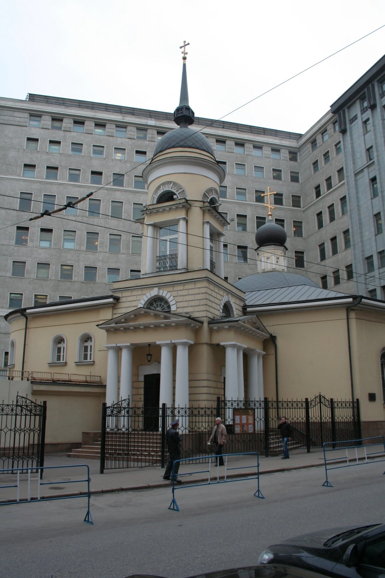 На представленной фотографии запечатлён храм Софии Премудрости Божией, расположенный в историческом центре Москвы неподалёку от Пушечного двора. Этот православный храм, освящённый в честь Софии — Премудрости Божией, представляет собой значимый памятник церковной архитектуры и истории русского православия.