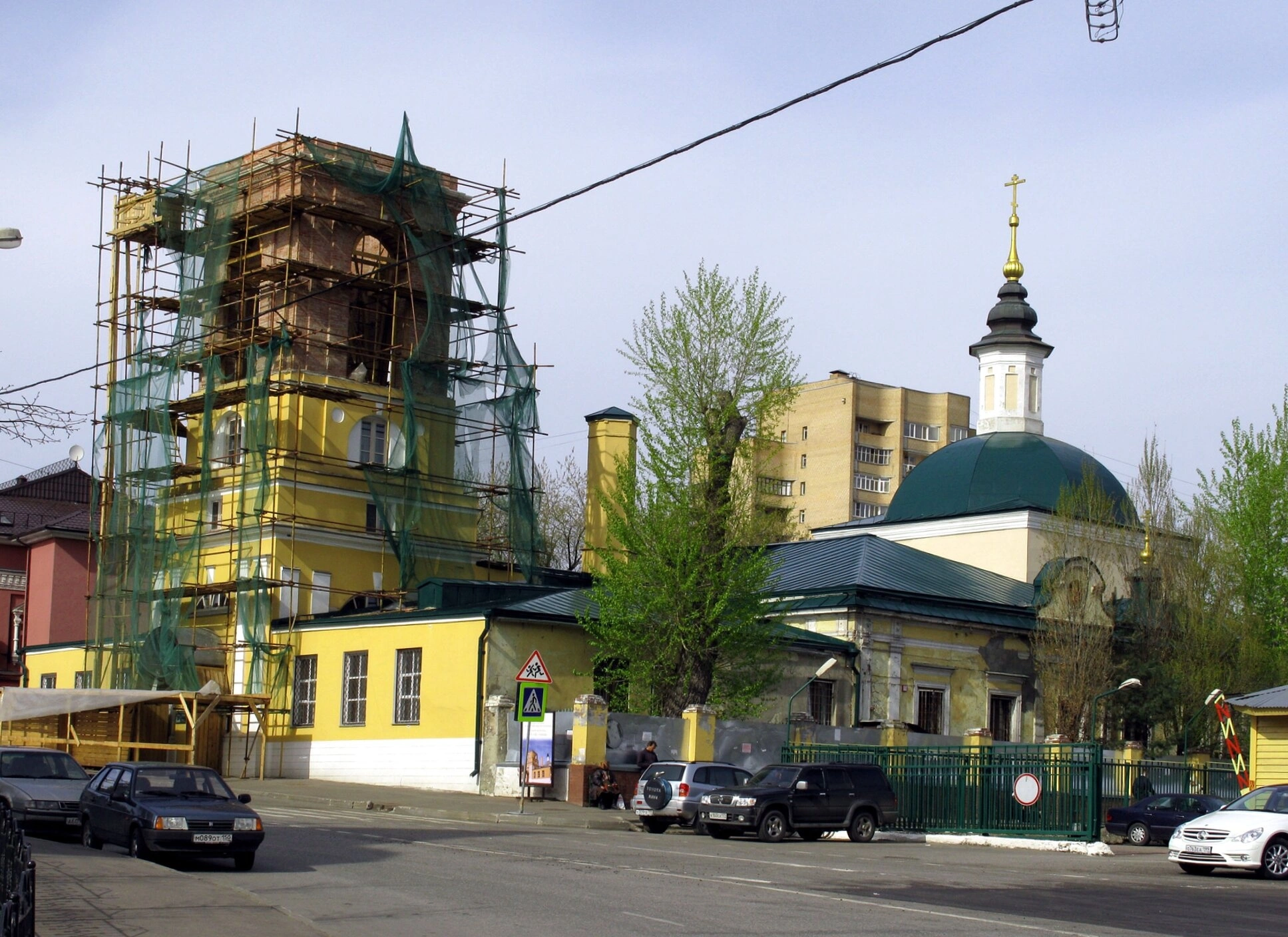 На фотографии запечатлён храм Сорока мучеников Севастийских в Спасской слободе Москвы, являющийся патриаршим подворьем и объектом культурного наследия федерального значения. Каменный храм был возведён в 1645 году на месте более древней деревянной церкви, предположительно существовавшей здесь с XVI века. Исторически эта местность связана с поселением каменщиков, строивших стены и соборы邻近него Новоспасского монастыря, что впоследствии отразилось в названиях nearby улиц — Большие и Малые Каменщики.