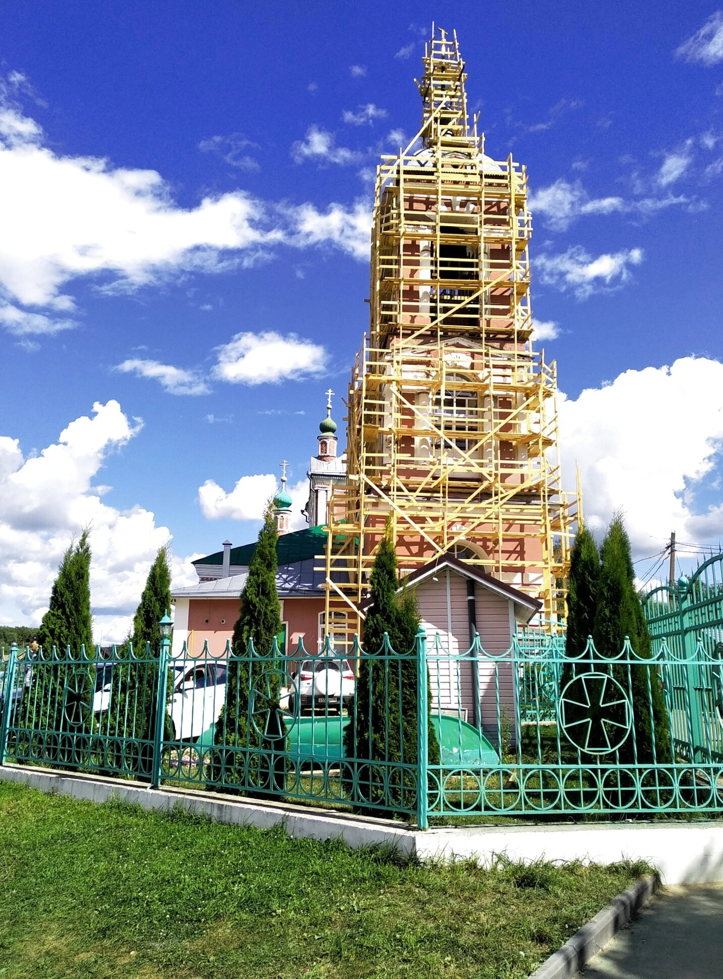 На снимке доминирует образ храма-исполина с розовато-красными стенами и зелёными кровлями. Колокольня, которую местные рыбаки исторически использовали как маяк, полностью скрыта лесами, символизируя непрекращающиеся труды по восстановлению святыни. На переднем плане виден зелёный оградительный забор и хвойные насаждения, подчёркивающие ухоженность территории. Светло-розовое здание слева, вероятно, является частью церковного комплекса или соседней постройки. Общее настроение фотографии создаёт контраст между временными строительными конструкциями и вечным, пронзительно ясным небом с кучевыми облаками, раскинувшимся над этим намоленным местом на берегу Плещеева озера.