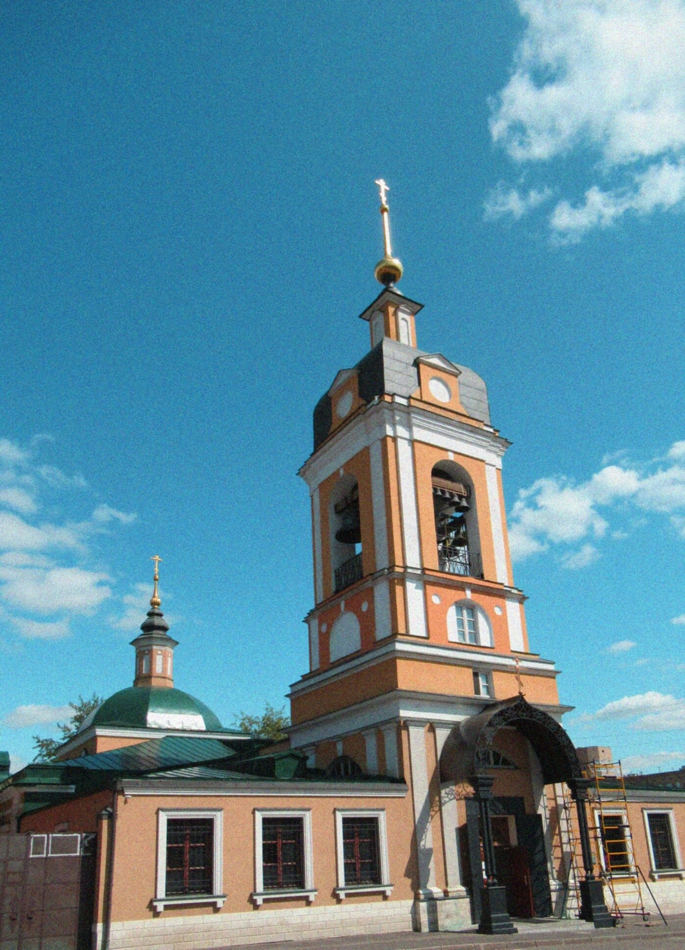 Архитектурный облик храма, представленный на снимке, гармонично сочетает традиции русского церковного зодчества. Основной объём здания выполнен из камня в тёплых желтоватых тонах, увенчан зелёным куполом, на котором гордо сияет православный крест, устремлённый в голубое небо. Рядом возвышается стройная колокольня, также увенчанная куполом, создающая единый молитвенный ансамбль. Фасад украшают арочные и прямоугольные оконные проёмы, а входная группа оформлена благолепной аркой.
