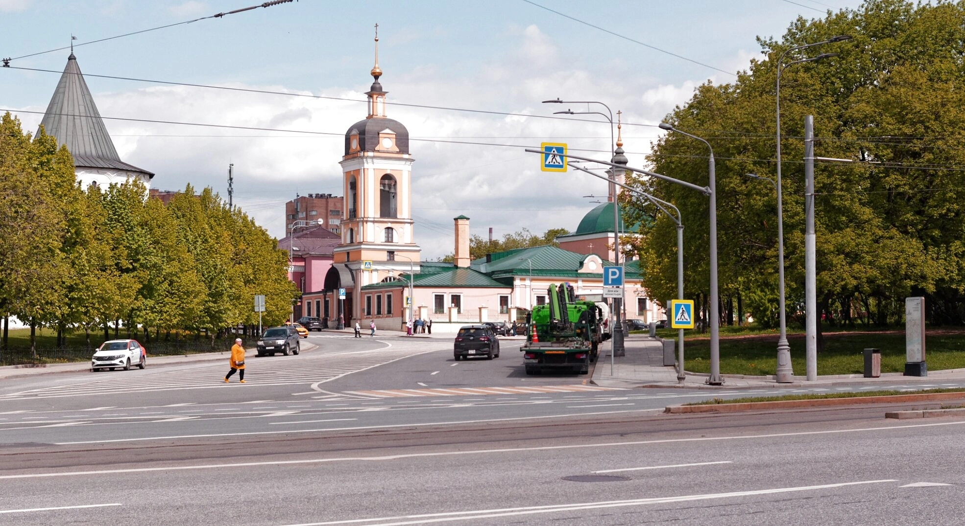 На переднем плане снимка видна оживлённая проезжая часть, пешеходный переход и зелёные насаждения, что подчёркивает гармоничное соседство древней православной святыни с динамичной жизнью мегаполиса. Храм, увенчанный традиционным луковичным куполом и стройной колокольней, выступает архитектурной и духовной доминантой данной местности.