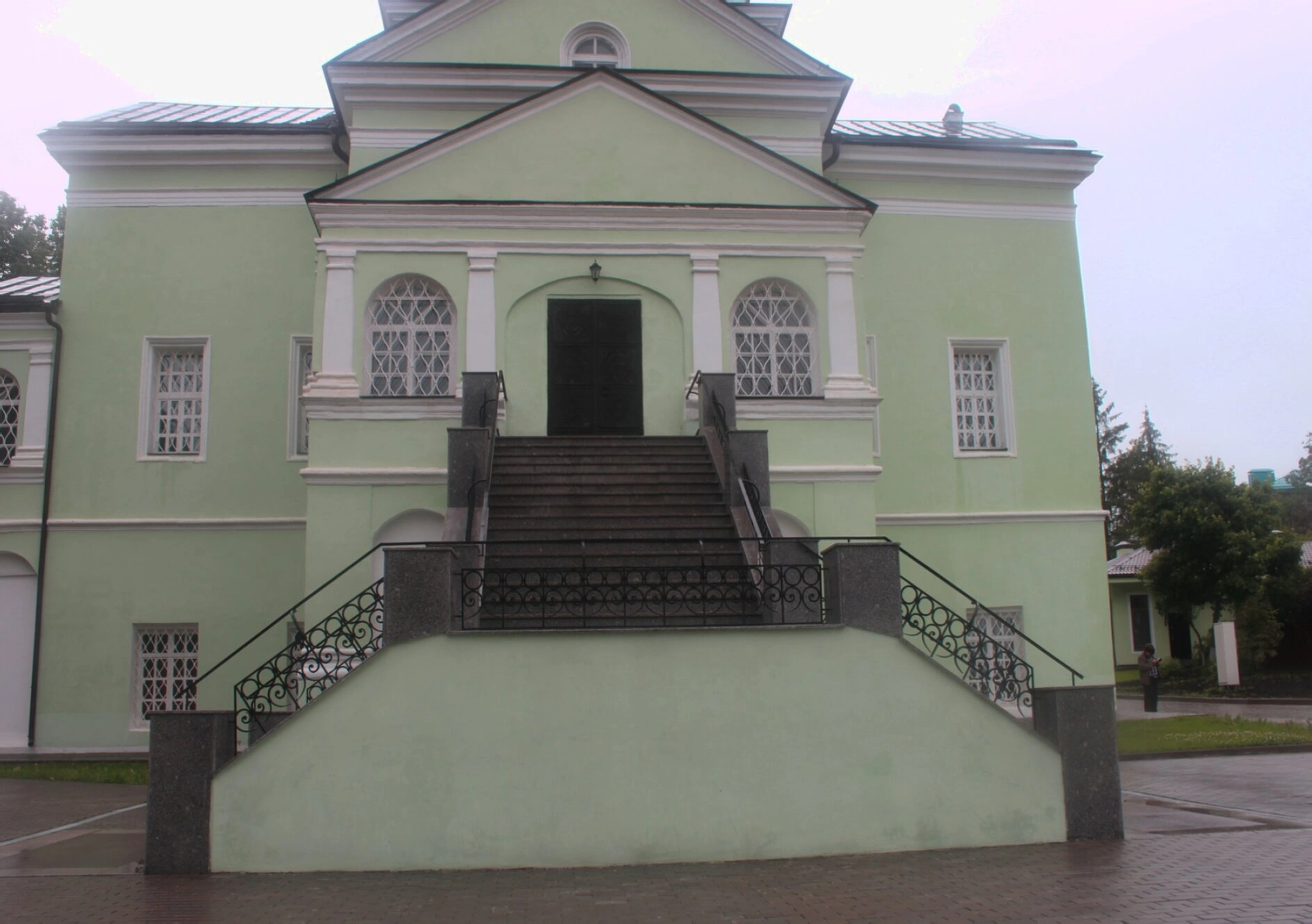 Храм гармонично вписан в окружающий ландшафт. На заднем плане виднеются кроны деревьев, указывающие на наличие благоустроенной парковой зоны, исторически связанной с усадебным комплексом. Мощёная территория вокруг здания добавляет ощущение благолепия и ухоженности этого святого места.