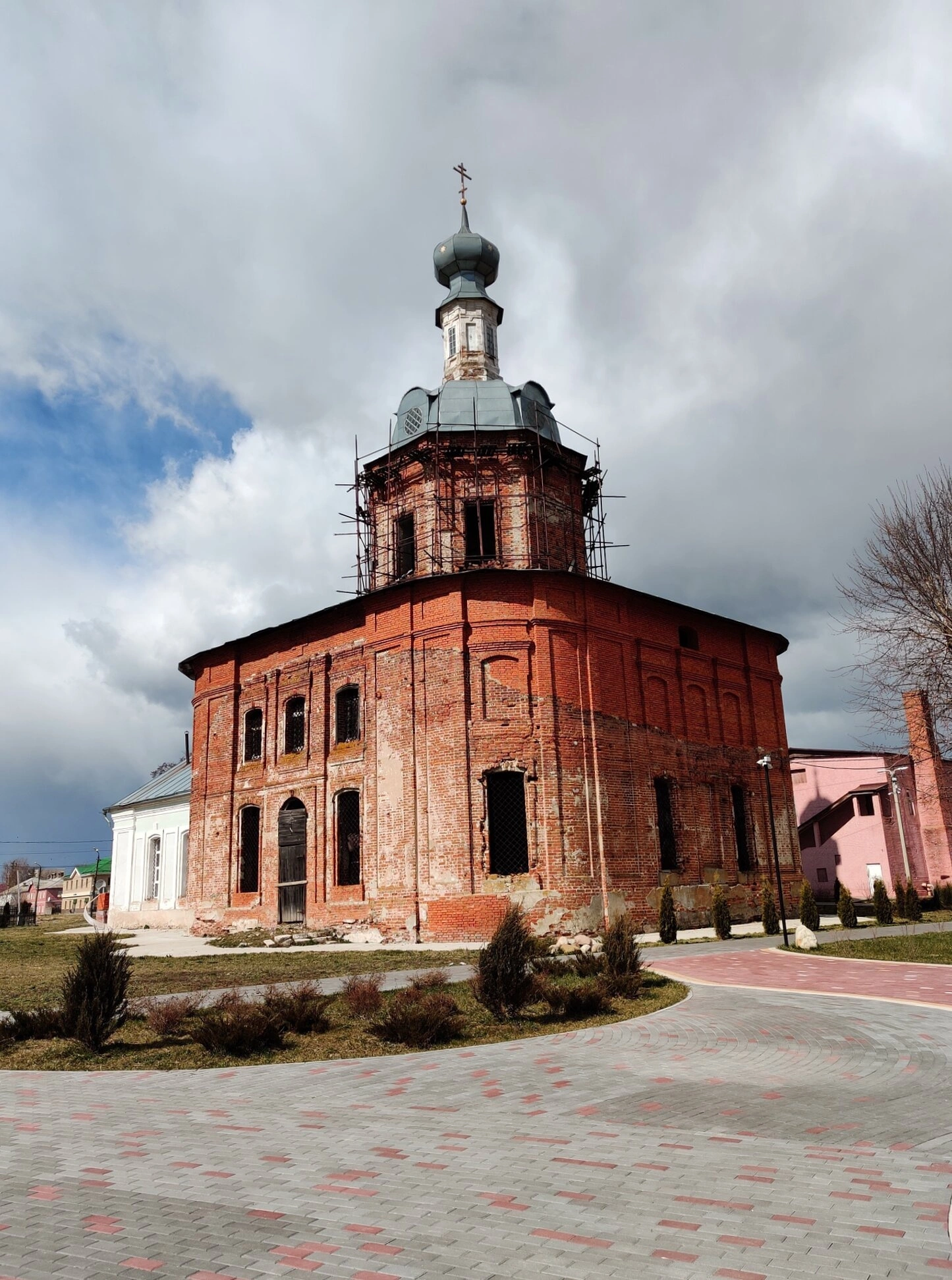На снимке можно наблюдать ведущиеся реставрационные работы на верхней части здания: куполе и колокольне, которые охвачены строительными лесами. Это свидетельствует о непрекращающейся заботе о сохранении духовного и культурного наследия. Кирпичное здание храма, несмотря на проводимые работы, выглядит величественно и благолепно.