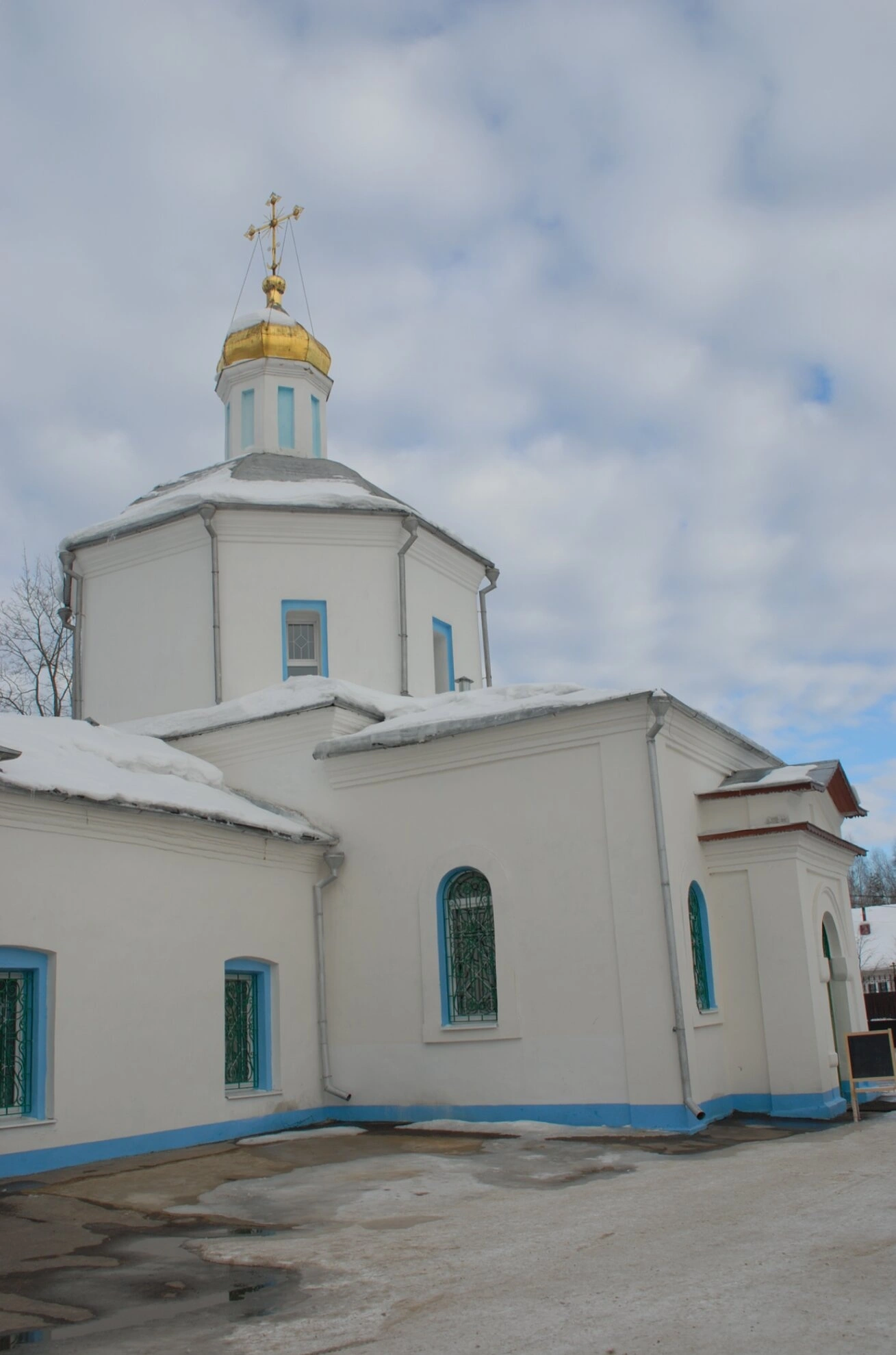 Величественное белоснежное здание храма, украшенное благородными синими элементами отделки и оконными рамами, сияет в зимний день. Архитектурный облик церкви гармонично сочетает традиции русского церковного зодчества с современными решениями. Центральный объём здания венчает златоверхий купол, увенчанный православным крестом, устремлённым в небеса.