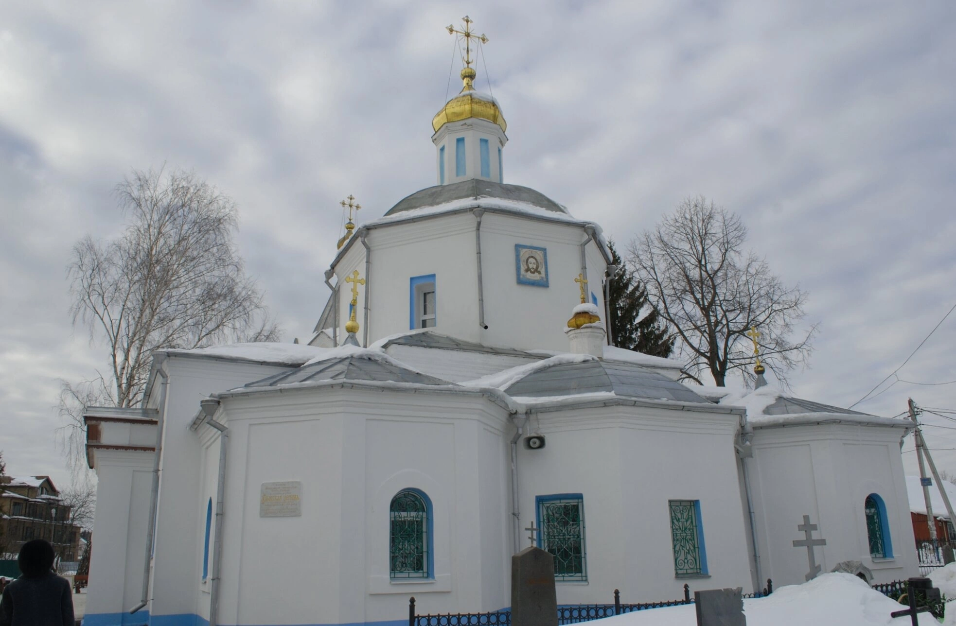Белоснежные стены церкви гармонично сочетаются с голубыми декоративными элементами, обрамляющими оконные проёмы и подчёркивающими цокольную часть здания. Яркими акцентами на фоне зимнего пейзажа сияют золочёные купола, увенчанные священными крестами, символизирующими победу жизни над смертью.