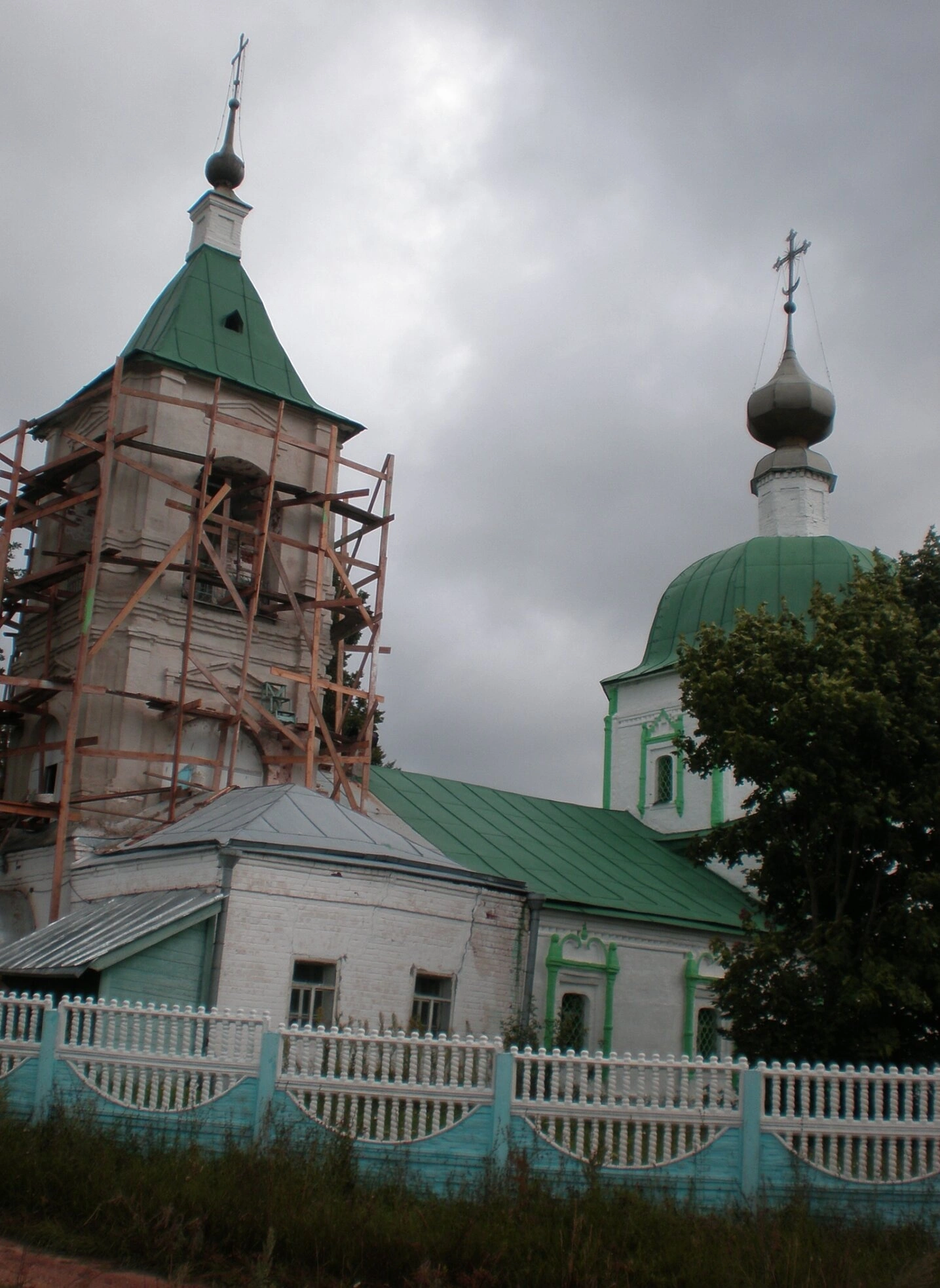 На снимке хорошо просматривается архитектурный облик церкви. Основной объём храма увенчан зелёным куполом, на котором установлен православный крест. Слева к основному зданию примыкает колокольня, которая на момент съёмки находилась на реставрации, о чём свидетельствуют установленные вокруг неё деревянные строительные леса. Подобные работы направлены на сохранение исторического и духовного наследия для будущих поколений.