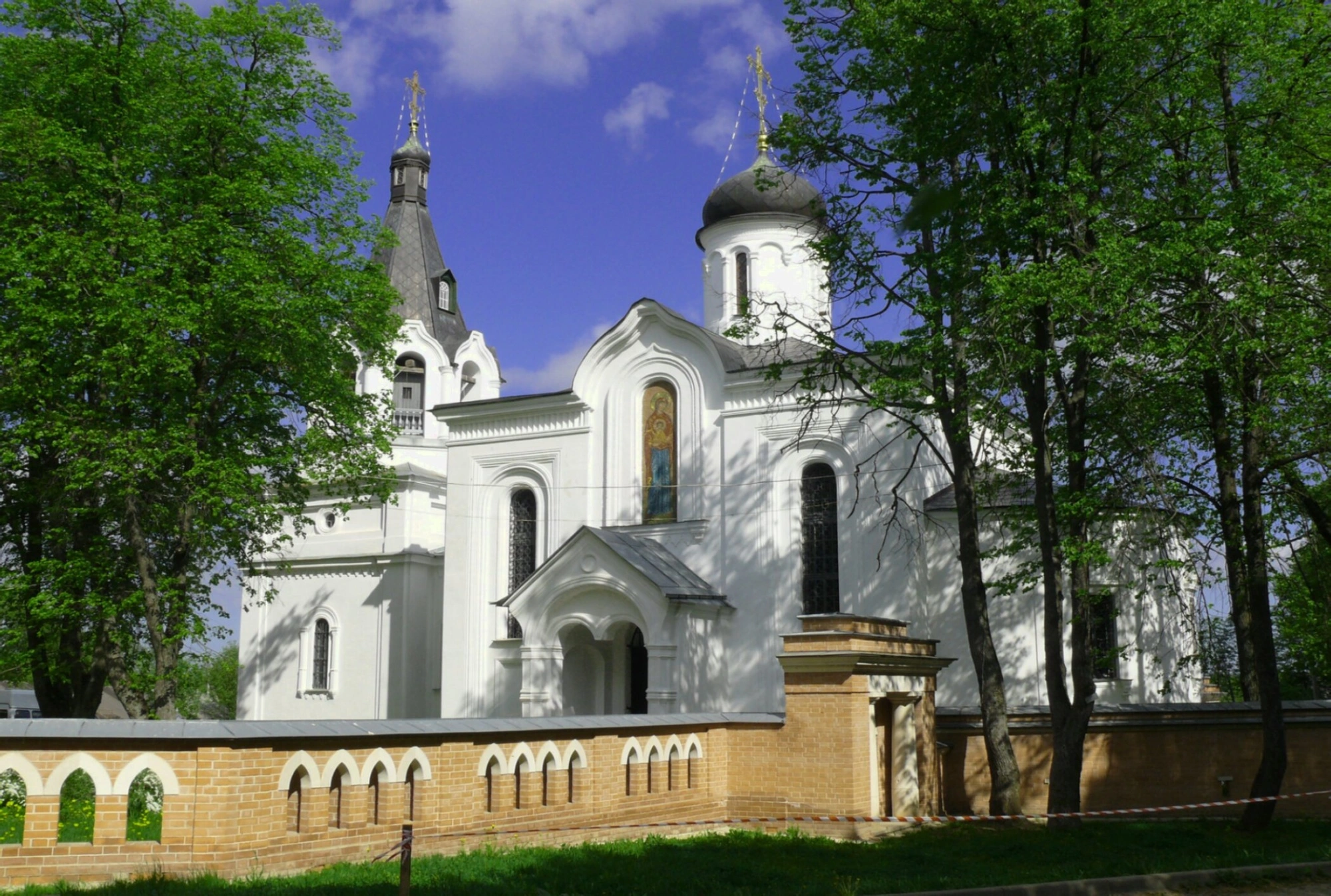 Святыня располагается в историческом центре старинной усадьбы князей Трубецких, окружённая ландшафтным парком, признанным памятником садово-паркового искусства. На переднем плане фотографии видна часть кирпичной ограды, что подчёркивает уединённый и молитвенный характер этого места. Храмовая территория утопает в зелени деревьев, создавая атмосферу благоговейной тишины и умиротворения.
