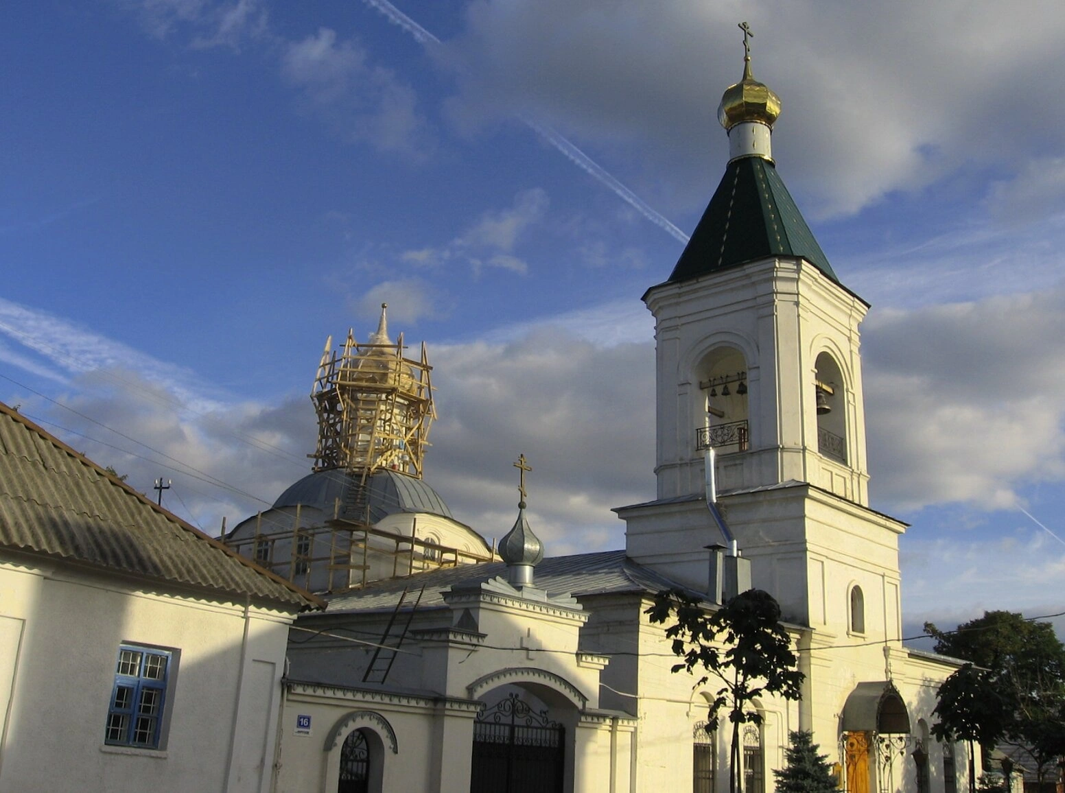 Несколько в стороне располагается основное здание храма, купол которого в момент съёмки был окружён строительными лесами, что свидетельствует о непрестанных трудах по благоукрашению и реставрации святого места. Традиционная луковичная форма главного купола узнаваема и символична для русского церковного зодчества.