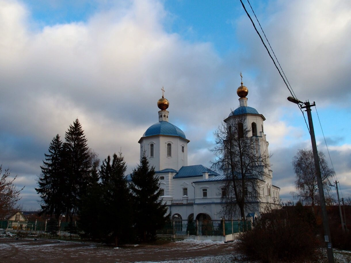 Храм располагается в живописном месте на Спасской улице, дом 12/1, в исторической местности, известной ранее как село Спасское-Телешово. Архитектурный облик церкви, запечатлённый на снимке, представляет собой образец русского церковного зодчества, гармонично вписанного в окружающий ландшафт. Белоснежные стены храма, увенчанные традиционными луковичными главами, создают образ благолепия и духовной чистоты.