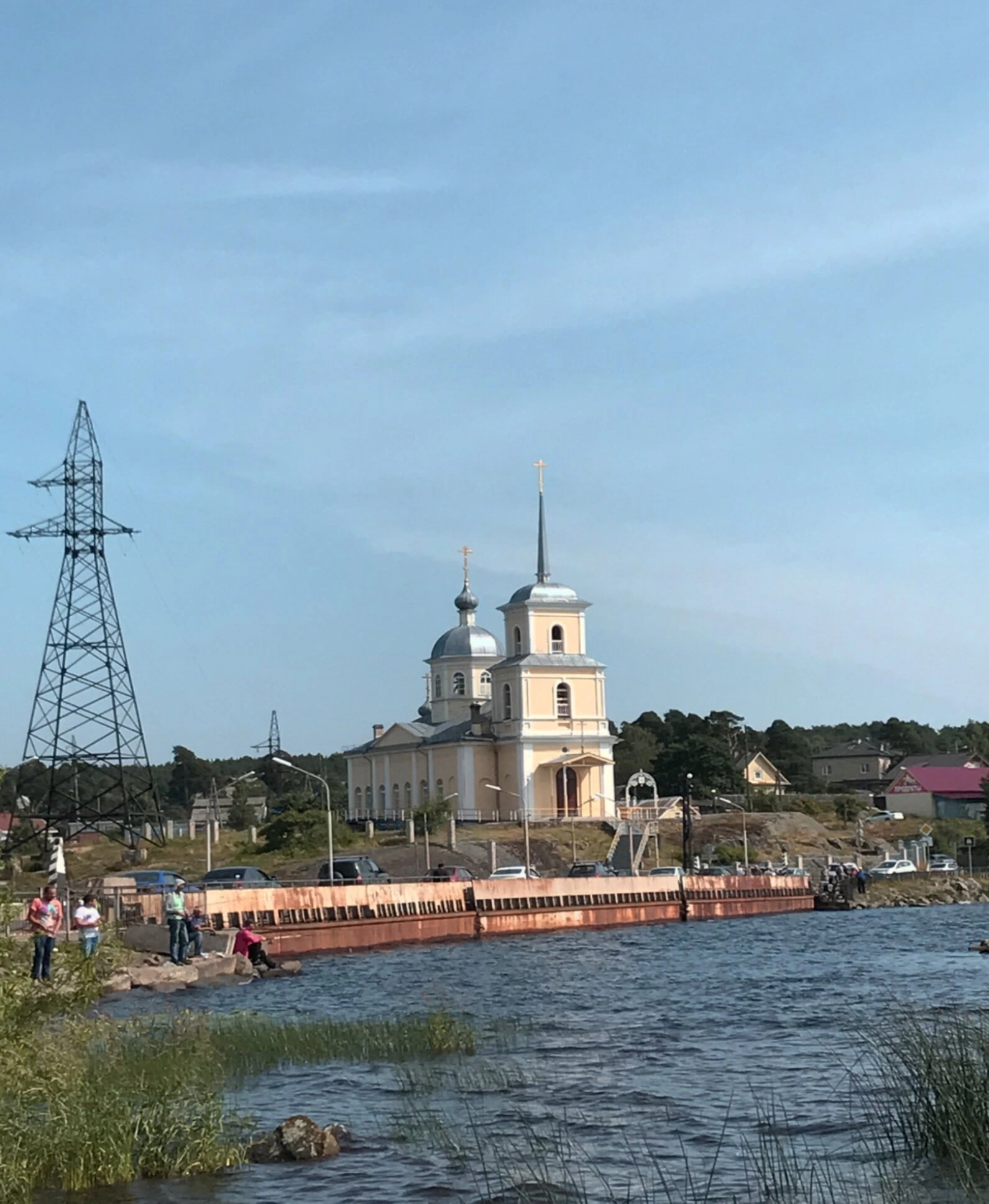 На представленной фотографии запечатлён величественный храм Сретения Господня, расположенный в столице Карелии — городе Петрозаводске. Белоснежный пятиглавый собор с золочёными куполами и сияющими крестами является архитектурной доминантой прибрежного пейзажа и важным духовным центром православной Карелии. Его стройный силуэт и светлые стены красиво отражаются в водах Онежского озера, которое видно справа от храма.